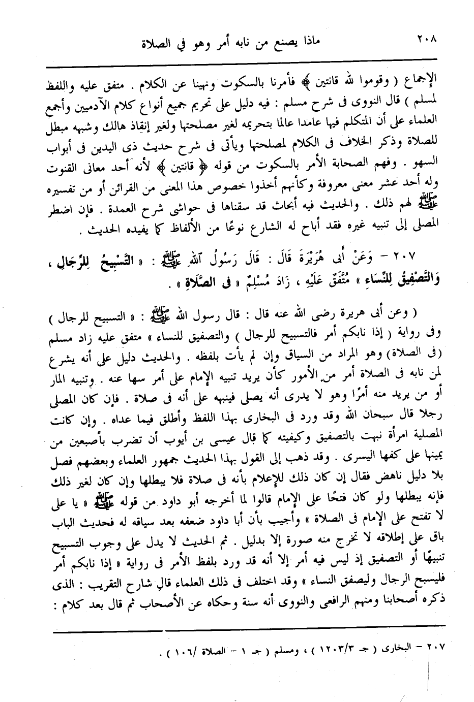 (207) - وَعَنْ أَبِي هُرَيْرَةَ قَالَ: قَالَ رَسُولُ اللَّهِ - صَلَّى اللَّهُ عَلَيْهِ وَسَلَّمَ - «التَّسْبِيحُ لِلرِّجَالِ، وَالتَّصْفِيقُ لِلنِّسَاءِ» مُتَّفَقٌ عَلَيْهِ، زَادَ مُسْلِمٌ " فِي الصَّلَاةِ ".