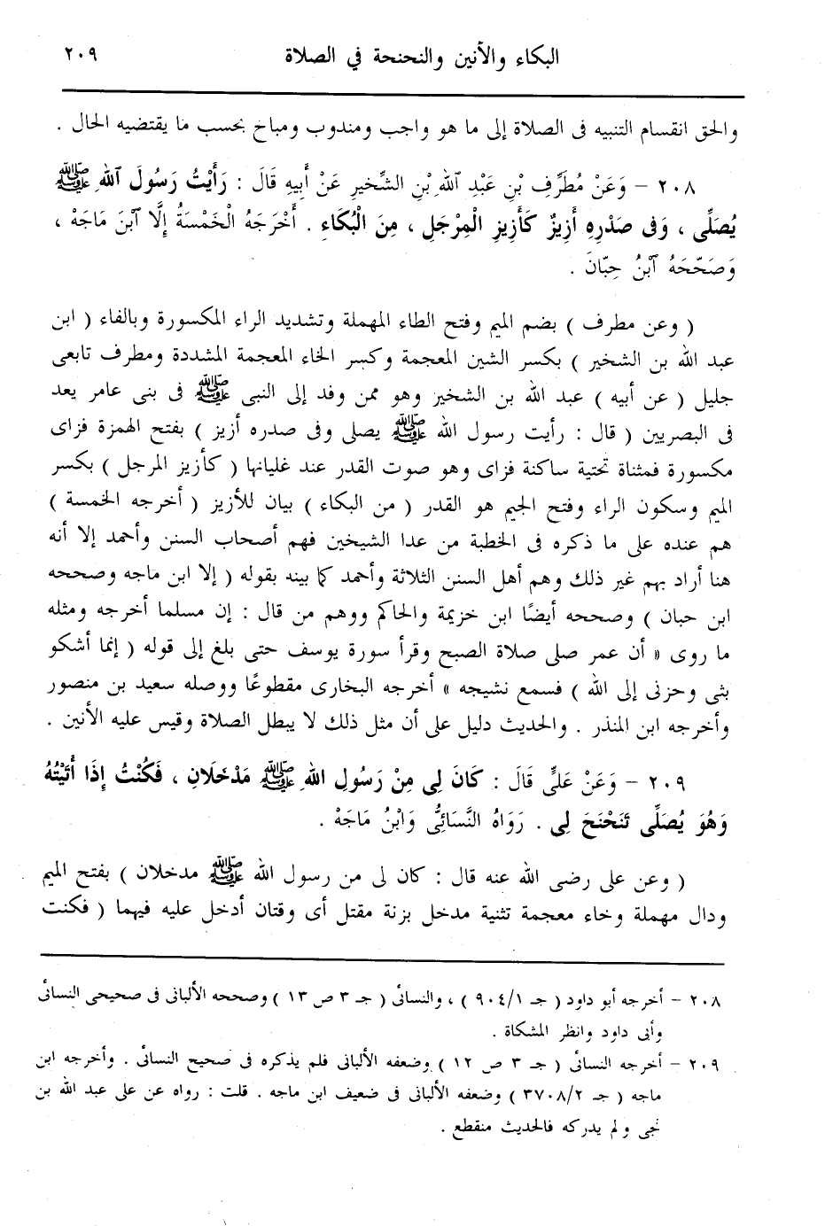 (208) - وَعَنْ مُطَرِّفِ بْنِ عَبْدِ اللَّهِ بْنِ الشِّخِّيرِ عَنْ أَبِيهِ قَالَ: «رَأَيْت رَسُولَ اللَّهِ - صَلَّى اللَّهُ عَلَيْهِ وَسَلَّمَ - يُصَلِّي، وَفِي صَدْرِهِ أَزِيزٌ كَأَزِيزِ الْمِرْجَلِ، مِنْ الْبُكَاءِ» . أَخْرَجَهُ الْخَمْسَةُ إلَّا ابْنَ مَاجَهْ، وَصَحَّحَهُ ابْنُ حِبَّانَ