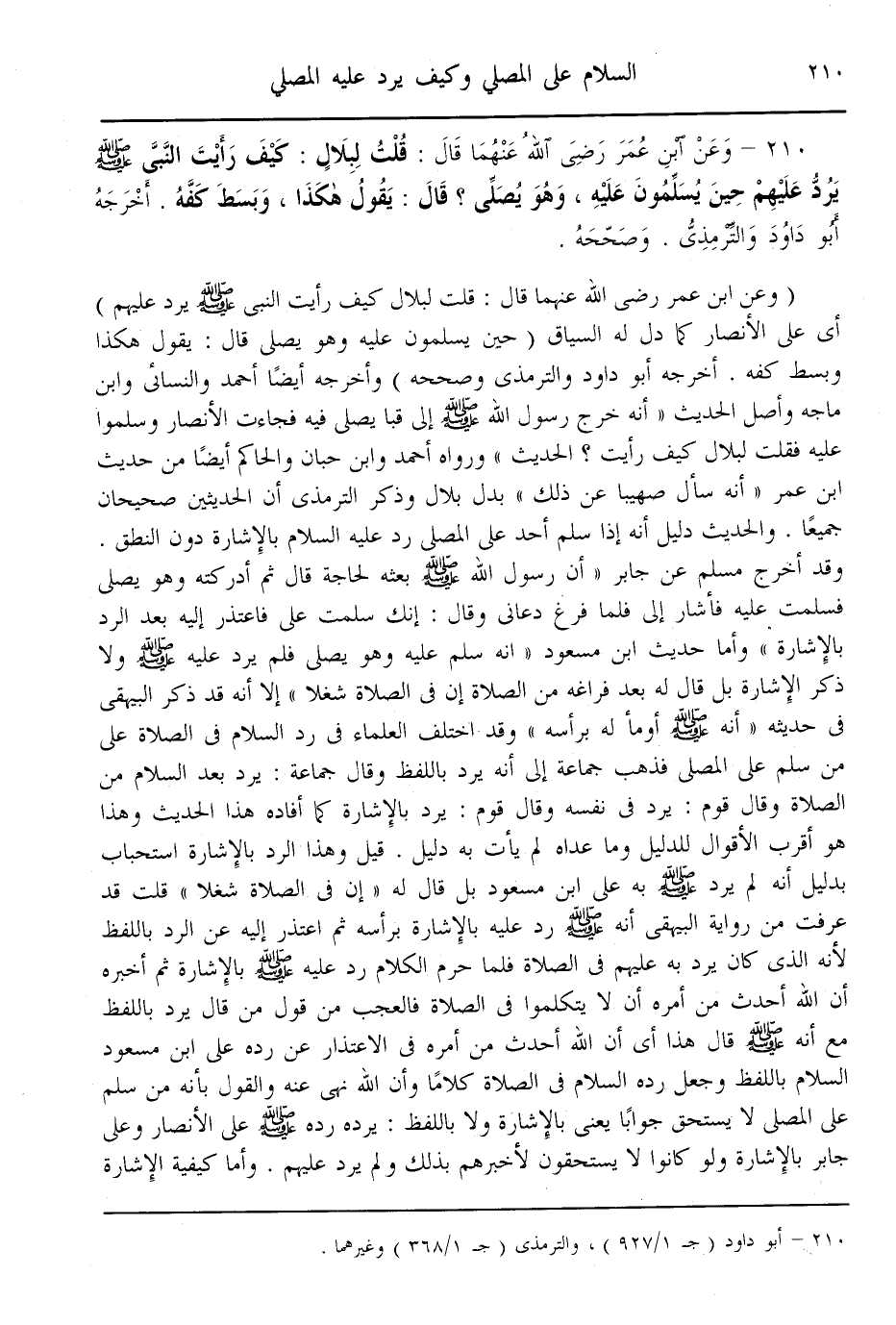 (210) - وَعَنْ ابْنِ عُمَرَ - رَضِيَ اللَّهُ عَنْهُمَا - قَالَ: «قُلْت لِبِلَالٍ: كَيْفَ رَأَيْت النَّبِيَّ - صَلَّى اللَّهُ عَلَيْهِ وَسَلَّمَ - يَرُدُّ عَلَيْهِمْ حِينَ يُسَلِّمُونَ عَلَيْهِ، وَهُوَ يُصَلِّي؟ قَالَ: يَقُولُ هَكَذَا، وَبَسَطَ كَفَّهُ» . أَخْرَجَهُ أَبُو دَاوُد وَالتِّرْمِذِيُّ وَصَحَّحَهُ.