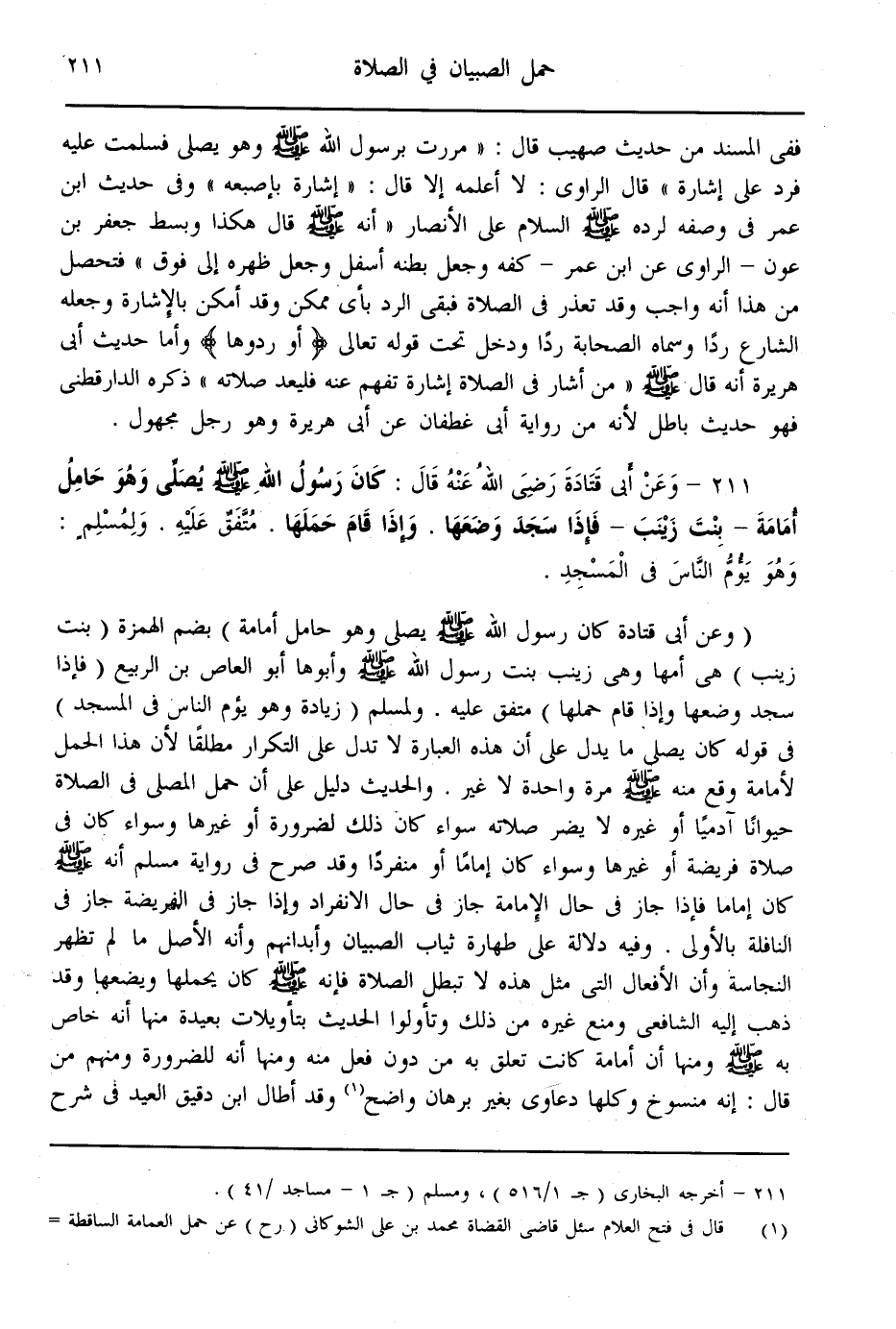 (211) - وَعَنْ أَبِي قَتَادَةَ - رَضِيَ اللَّهُ عَنْهُ - قَالَ: «كَانَ رَسُولُ اللَّهِ - صَلَّى اللَّهُ عَلَيْهِ وَسَلَّمَ - يُصَلِّي وَهُوَ حَامِلٌ أُمَامَةَ بِنْتَ زَيْنَبَ - فَإِذَا سَجَدَ وَضَعَهَا. وَإِذَا قَامَ حَمَلَهَا» . مُتَّفَقٌ عَلَيْهِ. وَلِمُسْلِمٍ: وَهُوَ يَؤُمَّ النَّاسَ فِي الْمَسْجِدِ.