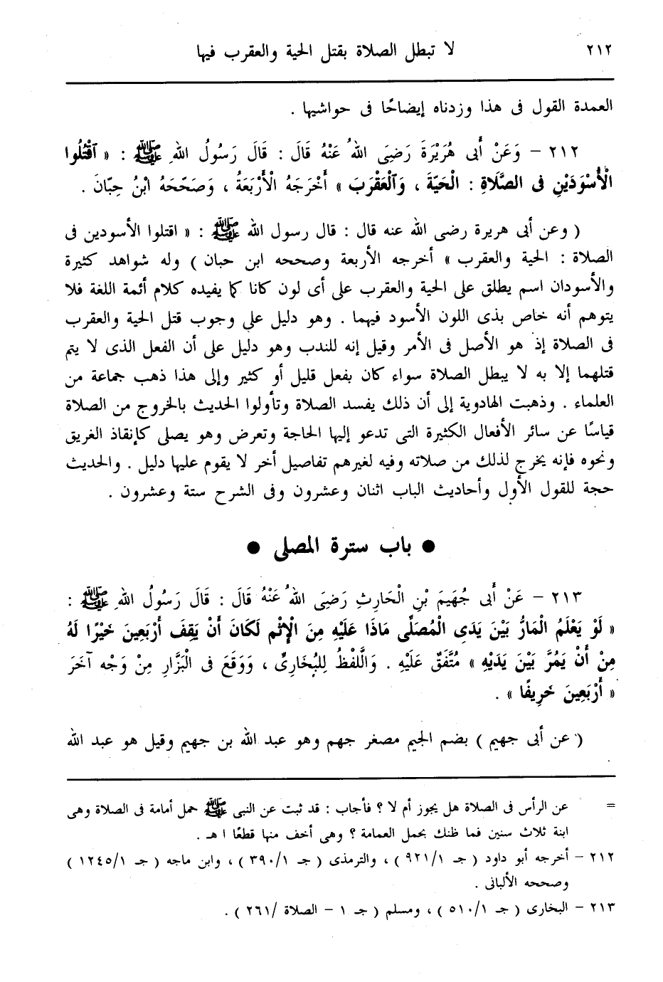 (212) - وَعَنْ أَبِي هُرَيْرَةَ - رَضِيَ اللَّهُ عَنْهُ - قَالَ: قَالَ رَسُولُ اللَّهِ - صَلَّى اللَّهُ عَلَيْهِ وَسَلَّمَ - «اُقْتُلُوا الْأَسْوَدَيْنِ فِي الصَّلَاةِ: الْحَيَّةَ، وَالْعَقْرَبَ» أَخْرَجَهُ الْأَرْبَعَةُ، وَصَحَّحَهُ ابْنُ حِبَّانَ