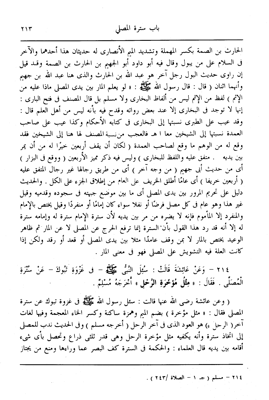 (214) - وَعَنْ عَائِشَةَ قَالَتْ: «سُئِلَ النَّبِيُّ - صَلَّى اللَّهُ عَلَيْهِ وَسَلَّمَ - فِي غَزْوَةِ تَبُوكَ - عَنْ سُتْرَةِ الْمُصَلِّي. فَقَالَ: مِثْلُ مُؤْخِرَةِ الرَّحْلِ» أَخْرَجَهُ مُسْلِمٌ
