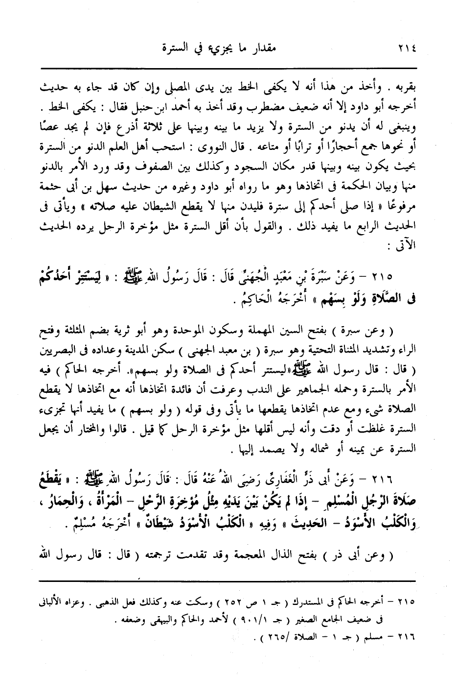 (215) - وَعَنْ سَبْرَةَ بْنِ مَعْبَدٍ الْجُهَنِيِّ قَالَ: قَالَ رَسُولُ اللَّهِ - صَلَّى اللَّهُ عَلَيْهِ وَسَلَّمَ - «لِيَسْتَتِرْ أَحَدُكُمْ فِي الصَّلَاةِ وَلَوْ بِسَهْمٍ» أَخْرَجَهُ الْحَاكِمُ. [وَعَنْ سَبْرَةَ بِفَتْحِ السِّينِ الْمُهْمَلَةِ وَسُكُونِ الْمُوَحَّدَةِ، وَهُوَ أَبُو ثُرَيَّةَ بِضَمِّ الْمُثَلَّثَةِ وَفَتْحِ الرَّاءِ وَتَشْدِيدِ الْمُثَنَّاةِ التَّحْتِيَّةِ وَهُوَ سَبْرَةُ بْنُ مَعْبَدٍ الْجُهَنِيُّ سَكَنَ الْمَدِينَةَ، وَعِدَادُهُ فِي الْبَصْرِيِّينَ. قَالَ: قَالَ رَسُولُ اللَّهِ - صَلَّى اللَّهُ عَلَيْهِ وَسَلَّمَ -: «لِيَسْتَتِرْ أَحَدُكُمْ فِي الصَّلَاةِ وَلَوْ بِسَهْمٍ» أَخْرَجَهُ الْحَاكِمُ