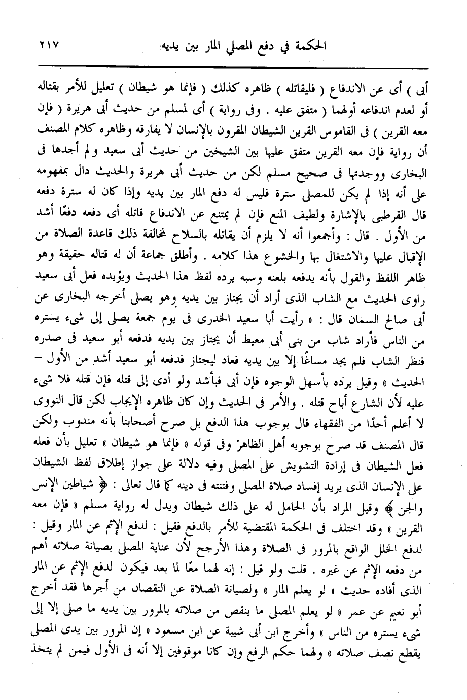 وَأَطْلَقَ جَمَاعَةٌ لَهُ قِتَالَهُ حَقِيقَةً، وَهُوَ ظَاهِرُ اللَّفْظِ، وَالْقَوْلُ بِأَنَّهُ يَدْفَعُهُ بِلَعْنِهِ وَسَبِّهِ يَرُدُّهُ لَفْظُ هَذَا الْحَدِيثِ، وَيُؤَيِّدُهُ فِعْلُ " أَبِي سَعِيدٍ " رَاوِي الْحَدِيثِ مَعَ الشَّابِّ الَّذِي أَرَادَ أَنْ يُجْتَازَ بَيْنَ يَدَيْهِ وَهُوَ يُصَلِّي؛ أَخْرَجَهُ الْبُخَارِيُّ عَنْ " أَبِي صَالِحٍ السَّمَّانِ " قَالَ: " رَأَيْت " أَبَا سَعِيدٍ الْخُدْرِيَّ " فِي يَوْمِ جُمُعَةٍ يُصَلِّي إلَى شَيْءٍ يَسْتُرُهُ مِنْ النَّاسِ، فَأَرَادَ شَابٌّ مِنْ " بَنِي أَبِي الْمُعَيْطِ " أَنْ يَجْتَازَ بَيْنَ يَدَيْهِ، فَدَفَعَهُ " أَبُو سَعِيدٍ " فِي صَدْرِهِ، فَنَظَرَ الشَّابُّ فَلَمْ يَجِدْ مَسَاغًا إلَّا بَيْنَ يَدَيْهِ، فَعَادَ لِيَجْتَازَ، فَدَفَعَهُ أَبُو سَعِيدٍ " أَشَدَّ مِنْ الْأَوَّلِ " الْحَدِيثَ.