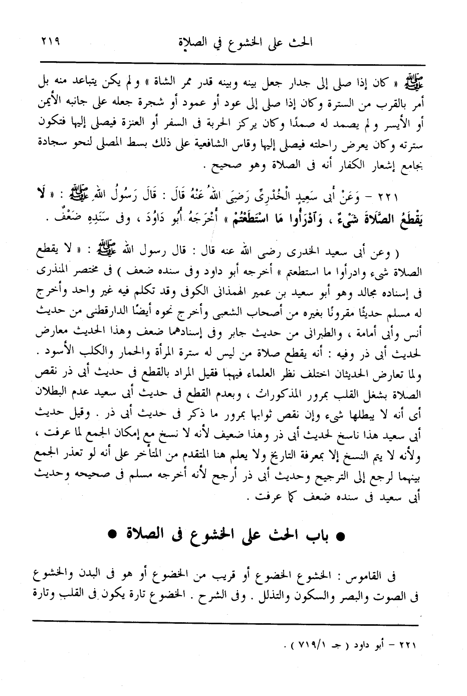 (221) - وَعَنْ أَبِي سَعِيدٍ الْخُدْرِيِّ - رَضِيَ اللَّهُ عَنْهُ - قَالَ: قَالَ رَسُولُ اللَّهِ - صَلَّى اللَّهُ عَلَيْهِ وَسَلَّمَ - «لَا يَقْطَعُ الصَّلَاةَ شَيْءٌ، وَادْرَءُوا مَا اسْتَطَعْتُمْ» أَخْرَجَهُ أَبُو دَاوُد، وَفِي سَنَدِهِ ضَعْفٌ.