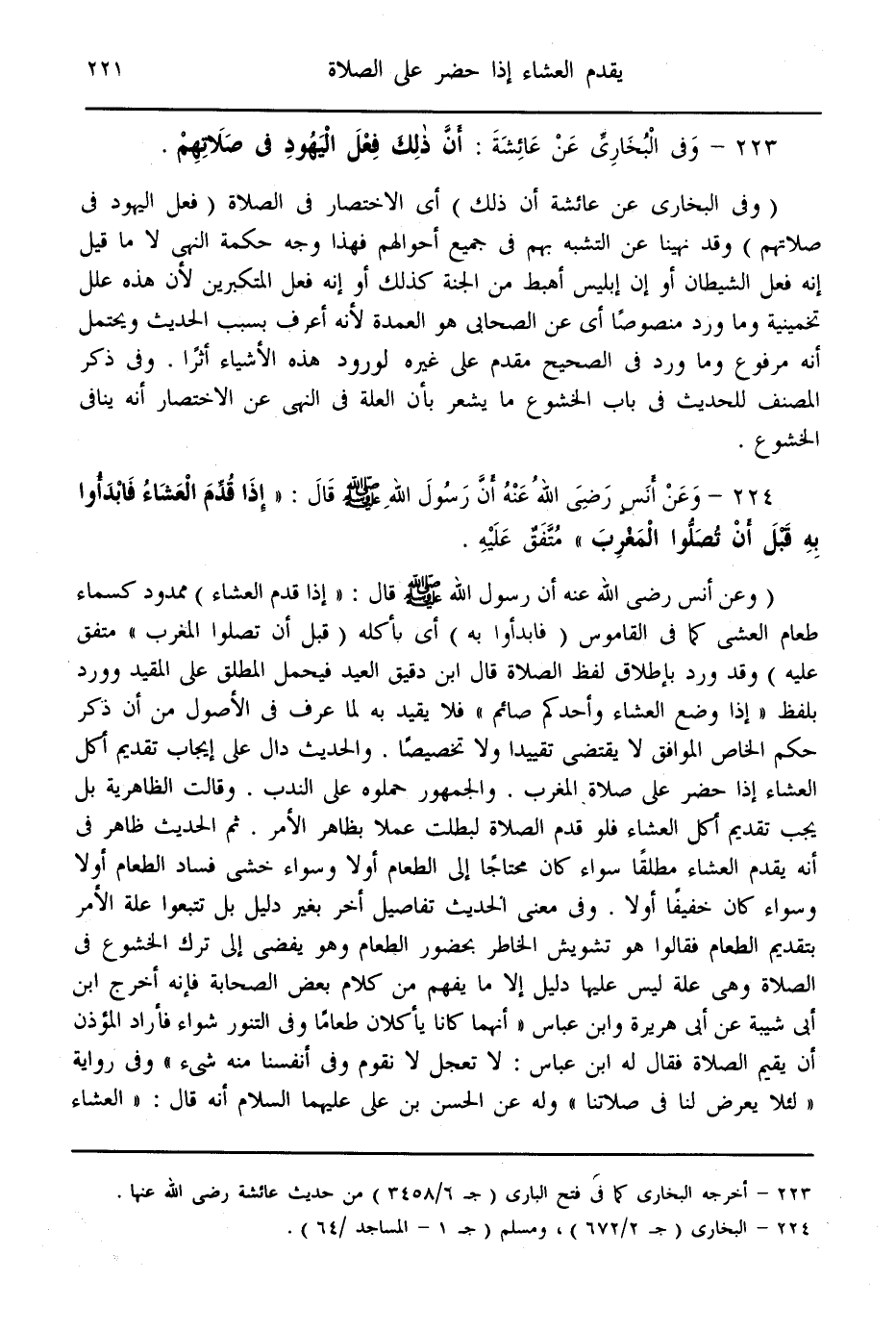 (224) - وَعَنْ أَنَسٍ - رَضِيَ اللَّهُ عَنْهُ - أَنَّ رَسُولَ اللَّهِ - صَلَّى اللَّهُ عَلَيْهِ وَسَلَّمَ - قَالَ: «إذَا قُدِّمَ الْعَشَاءُ فَابْدَءُوا بِهِ قَبْلَ أَنْ تُصَلُّوا الْمَغْرِبَ» مُتَّفَقٌ عَلَيْهِ.