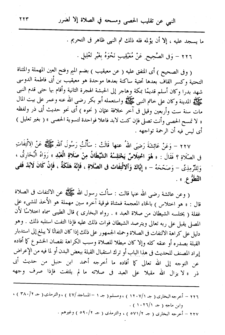 (226) - وَفِي الصَّحِيحِ عَنْ مُعَيْقِيبٍ نَحْوُهُ بِغَيْرِ تَعْلِيلٍ. [وَفِي الصَّحِيحِ] أَيْ الْمُتَّفَقِ عَلَيْهِ [عَنْ " مُعَيْقِيبٍ " بِضَمِّ الْمِيمِ وَفَتْحِ الْعَيْنِ الْمُهْمَلَةِ وَالْمُثَنَّاةِ التَّحْتِيَّةِ وَكَسْرِ الْقَافِ بَعْدَهَا تَحْتِيَّةٌ سَاكِنَةٌ بَعْدَهَا مُوَحَّدَةٌ. هُوَ " مُعَيْقِيبُ بْنُ أَبِي فَاطِمَةَ الدَّوْسِيُّ "، شَهِدَ بَدْرًا وَكَانَ أَسْلَمَ قَدِيمًا بِمَكَّةَ، وَهَاجَرَ إلَى الْحَبَشَةِ الْهِجْرَةَ الثَّانِيَةَ، وَأَقَامَ بِهَا حَتَّى قَدِمَ النَّبِيُّ - صَلَّى اللَّهُ عَلَيْهِ وَسَلَّمَ - الْمَدِينَةَ، وَكَانَ عَلَى خَاتَمِ النَّبِيِّ - صَلَّى اللَّهُ عَلَيْهِ وَسَلَّمَ -، وَاسْتَعْمَلَهُ " أَبُو بَكْرٍ "، وَعُمَرُ " - رَضِيَ اللَّهُ عَنْهُمَا - عَلَى بَيْتِ الْمَالِ مَاتَ سَنَةَ سِتٍّ وَأَرْبَعِينَ، وَقِيلَ: فِي آخَرِ خِلَافَةِ عُثْمَانَ. [نَحْوُهُ] أَيْ نَحْوُ حَدِيثِ " أَبِي ذَرٍّ " وَلَفْظُهُ: «لَا تَمْسَحُ الْحَصَى وَأَنْتَ تُصَلِّي فَإِنْ كُنْت لَا بُدَّ فَاعِلًا فَوَاحِدَةً لِتَسْوِيَةِ الْحَصَى»