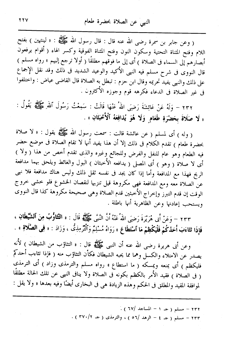 (232) - وَلَهُ عَنْ عَائِشَةَ - رَضِيَ اللَّهُ عَنْهَا - قَالَتْ: سَمِعْت رَسُولَ اللَّهِ - صَلَّى اللَّهُ عَلَيْهِ وَسَلَّمَ - يَقُولُ: «لَا صَلَاةَ بِحَضْرَةِ طَعَامٍ وَلَا هُوَ يُدَافِعُهُ الْأَخْبَثَانِ» .