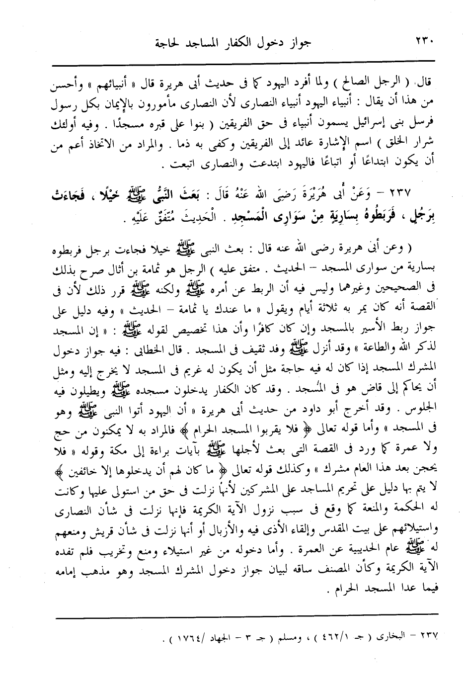 (237) - وَعَنْ أَبِي هُرَيْرَةَ - رَضِيَ اللَّهُ عَنْهُ - قَالَ: «بَعَثَ النَّبِيُّ - صَلَّى اللَّهُ عَلَيْهِ وَسَلَّمَ - خَيْلًا، فَجَاءَتْ بِرَجُلٍ، فَرَبَطُوهُ بِسَارِيَةٍ مِنْ سِوَارِي الْمَسْجِدِ» . الْحَدِيثُ مُتَّفَقٌ عَلَيْهِ.