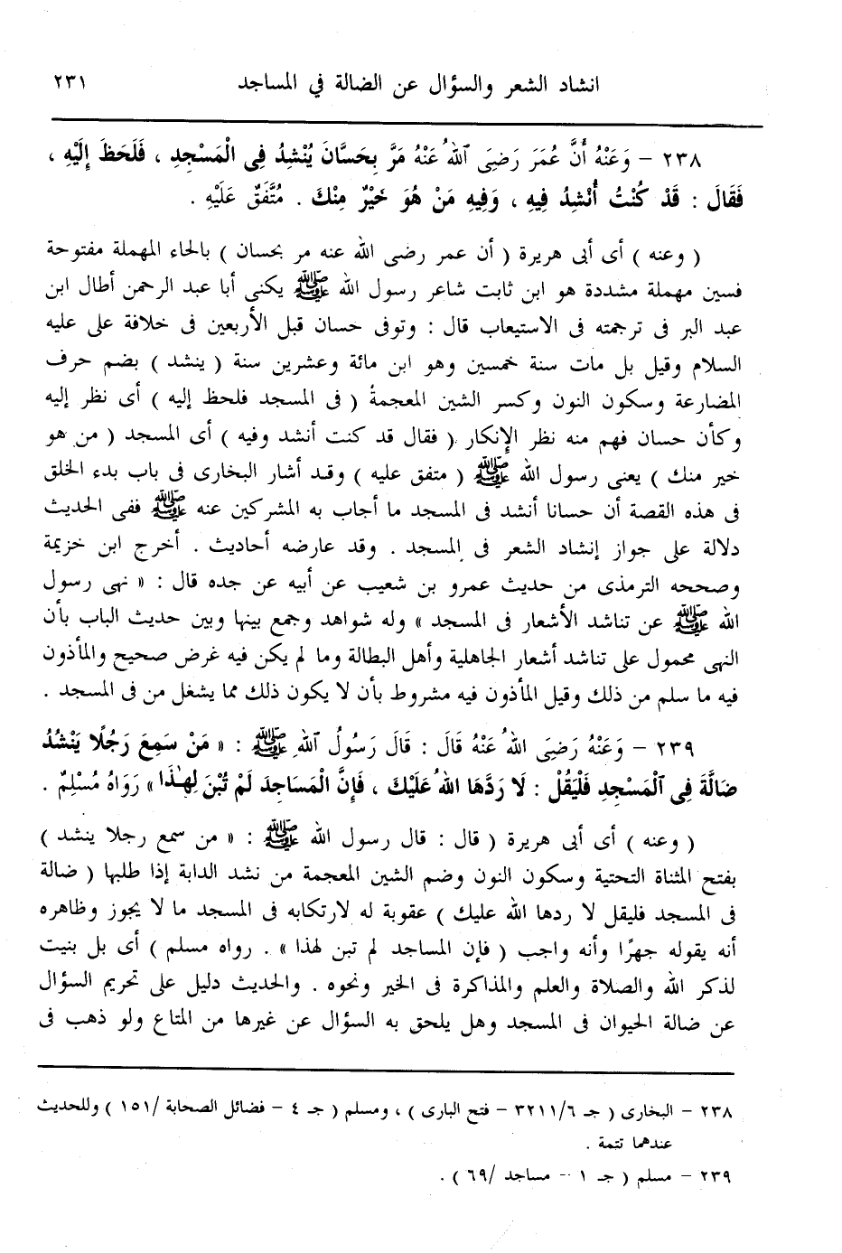 (238) - وَعَنْهُ «أَنَّ عُمَرَ - رَضِيَ اللَّهُ عَنْهُ - مَرَّ بِحَسَّانَ يُنْشِدُ فِي الْمَسْجِدِ، فَلَحَظَ إلَيْهِ، فَقَالَ: قَدْ كُنْت أُنْشِدُ فِيهِ، وَفِيهِ مَنْ هُوَ خَيْرٌ مِنْك.» مُتَّفَقٌ عَلَيْهِ.