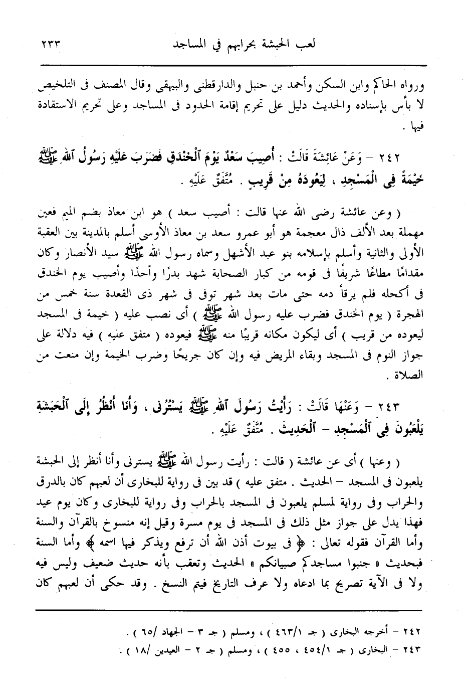 (243) - وَعَنْهَا قَالَتْ: «رَأَيْت رَسُولَ اللَّهِ - صَلَّى اللَّهُ عَلَيْهِ وَسَلَّمَ - يَسْتُرُنِي، وَأَنَا أَنْظُرُ إلَى الْحَبَشَةِ يَلْعَبُونَ فِي الْمَسْجِدِ» - الْحَدِيثُ. مُتَّفَقٌ عَلَيْهِ.