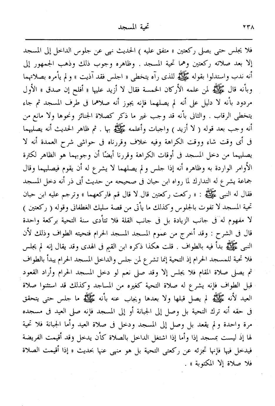 قُلْت هَكَذَا ذَكَرَهُ ابْنُ الْقَيِّمِ فِي الْهَدْيِ وَقَدْ يُقَالُ إنَّهُ لَمْ يَجْلِسْ فَلَا تَحِيَّةَ لِلْمَسْجِدِ الْحَرَامِ إذْ التَّحِيَّةُ إنَّمَا تُشْرَعُ لِمَنْ جَلَسَ وَالدَّاخِلُ الْمَسْجِدَ الْحَرَامَ يَبْدَأُ بِالطَّوَافِ ثُمَّ يُصَلِّي صَلَاةَ الْمُقَامِ فَلَا يَجْلِسْ إلَّا وَقَدْ صَلَّى، نَعَمْ لَوْ دَخَلَ الْمَسْجِدَ الْحَرَامَ وَأَرَادَ الْقُعُودَ قَبْلَ الطَّوَافِ فَإِنَّهُ يُشْرَعُ لَهُ صَلَاةُ التَّحِيَّةِ كَغَيْرِهِ مِنْ الْمَسَاجِدِ، وَكَذَلِكَ قَدْ اسْتَثْنَوْا صَلَاةَ الْعِيدِ لِأَنَّهُ - صَلَّى اللَّهُ عَلَيْهِ وَسَلَّمَ - لَمْ يُصَلِّ قَبْلَهَا وَلَا بَعْدَهَا وَيُجَابُ عَنْهُ بِأَنَّهُ - صَلَّى اللَّهُ عَلَيْهِ وَسَلَّمَ - مَا جَلَسَ حَتَّى يَتَحَقَّقَ فِي حَقِّهِ أَنَّهُ تَرَكَ التَّحِيَّةَ بَلْ وَصَلَ إلَى الْجَبَّانَةِ أَوْ إلَى الْمَسْجِدِ فَإِنَّهُ صَلَّى الْعِيدَ فِي مَسْجِدِهِ مَرَّةً وَاحِدَةً وَلَمْ يَقْعُدْ بَلْ وَصَلَ إلَى الْمَسْجِدِ وَدَخَلَ فِي صَلَاةِ الْعِيدِ وَأَمَّا الْجَبَّانَةُ فَلَا تَحِيَّةَ لَهَا إذْ لَيْسَتْ بِمَسْجِدٍ وَأَمَّا إذَا اسْتَغَلَّ الدَّاخِلُ بِالصَّلَاةِ كَأَنْ يَدْخُلَ وَقَدْ أُقِيمَتْ الْفَرِيضَةُ فَيَدْخُلَ فِيهَا فَإِنَّهَا تُجْزِئْهُ عَنْ رَكْعَتَيْ التَّحِيَّةِ بَلْ هُوَ مَنْهِيٌّ عَنْهَا بِحَدِيثِ: «إذَا أُقِيمَتْ الصَّلَاةُ فَلَا صَلَاةَ إلَّا الْمَكْتُوبَةُ» .