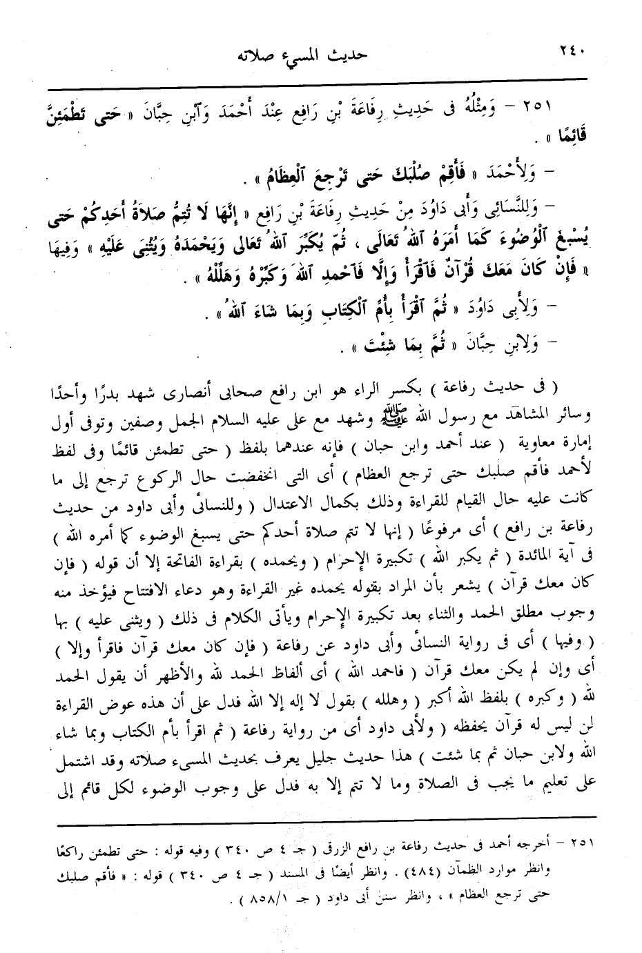 (251) - وَمِثْلُهُ فِي حَدِيثِ رِفَاعَةَ بْنِ رَافِعٍ عِنْدَ أَحْمَدَ وَابْنِ حِبَّانَ " حَتَّى تَطْمَئِنَّ قَائِمًا " - وَلِأَحْمَدَ «فَأَقِمْ صُلْبَك حَتَّى تَرْجِعَ الْعِظَامُ» - وَلِلنَّسَائِيِّ وَأَبِي دَاوُد مِنْ حَدِيثِ رِفَاعَةَ بْنِ رَافِعٍ «إنَّهَا لَا تَتِمُّ صَلَاةُ أَحَدِكُمْ حَتَّى يُسْبِغَ الْوُضُوءَ كَمَا أَمَرَهُ اللَّهُ تَعَالَى، ثُمَّ يُكَبِّرَ اللَّهَ تَعَالَى وَيَحْمَدَهُ وَيُثْنِي عَلَيْهِ فِيهَا فَإِنْ كَانَ مَعَك قُرْآنٌ فَاقْرَأْ وَإِلَّا فَاحْمَدْ اللَّهَ وَكَبِّرْهُ وَهَلِّلْهُ» - وَلِأَبِي دَاوُد «ثُمَّ اقْرَأْ بِأُمِّ الْكِتَابِ وَبِمَا شَاءَ اللَّهُ» - وَلِأَبِي حِبَّانَ " ثُمَّ بِمَا شِئْت ".