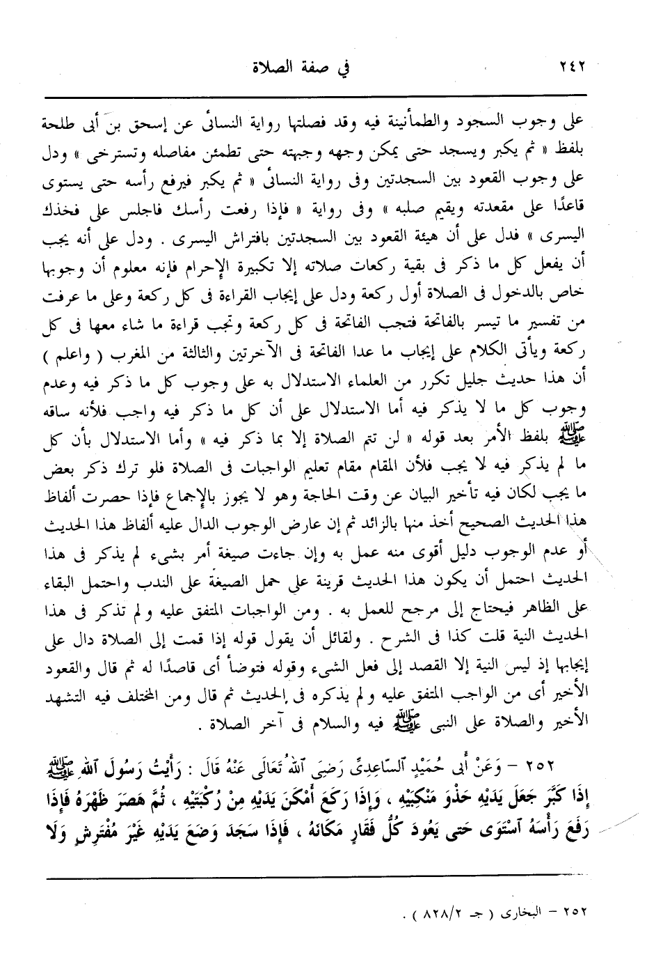 (252) - وَعَنْ أَبِي حُمَيْدٍ السَّاعِدِيِّ - رَضِيَ اللَّهُ تَعَالَى عَنْهُ - قَالَ: «رَأَيْت رَسُولَ اللَّهِ - صَلَّى اللَّهُ عَلَيْهِ وَسَلَّمَ - إذَا كَبَّرَ جَعَلَ يَدَيْهِ حَذْوَ مَنْكِبَيْهِ، وَإِذَا رَكَعَ أَمْكَنَ يَدَيْهِ مِنْ رُكْبَتَيْهِ، ثُمَّ هَصَرَ ظَهْرَهُ فَإِذَا رَفَعَ رَأْسَهُ اسْتَوَى حَتَّى يَعُودَ كُلُّ فَقَارٍ مَكَانَهُ، فَإِذَا سَجَدَ وَضَعَ يَدَيْهِ غَيْرَ مُفْتَرِشٍ وَلَا