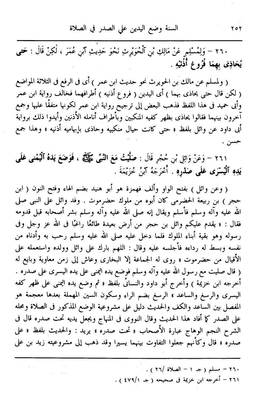 (261) - وَعَنْ وَائِلِ بْنِ حُجْرٍ قَالَ: «صَلَّيْت مَعَ النَّبِيِّ - صَلَّى اللَّهُ عَلَيْهِ وَسَلَّمَ -، فَوَضَعَ يَدَهُ الْيُمْنَى عَلَى يَدِهِ الْيُسْرَى عَلَى صَدْرِهِ» . أَخْرَجَهُ ابْنُ خُزَيْمَةَ.