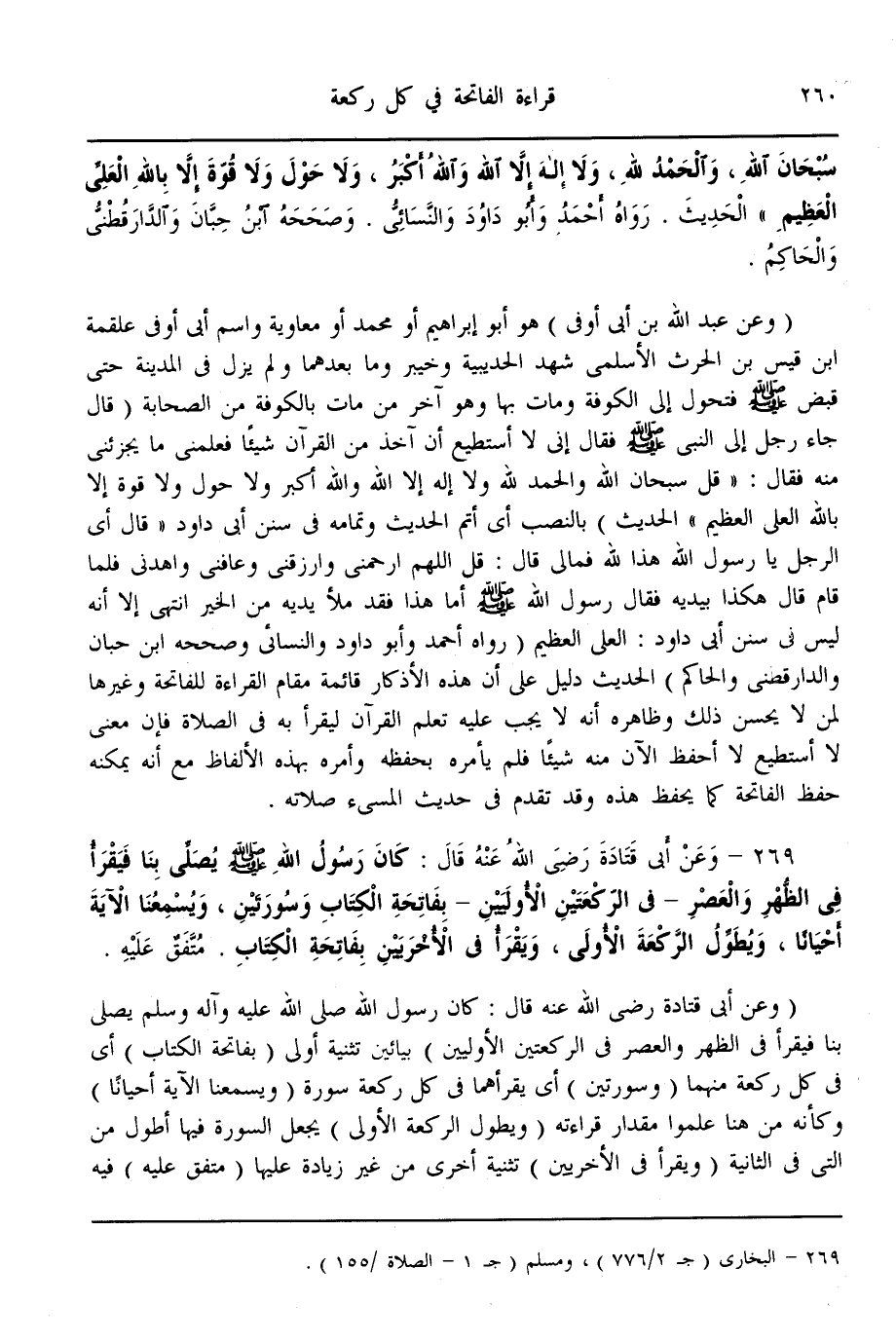 قَالَ: «جَاءَ رَجُلٌ إلَى النَّبِيِّ - صَلَّى اللَّهُ عَلَيْهِ وَسَلَّمَ - فَقَالَ: إنِّي لَا أَسْتَطِيعُ أَنْ آخُذَ مِنْ الْقُرْآنِ شَيْئًا فَعَلِّمْنِي مَا يُجْزِئُنِي عَنْهُ، فَقَالَ: قُلْ سُبْحَانَ اللَّهِ وَالْحَمْدُ لِلَّهِ وَلَا إلَهَ إلَّا اللَّهُ وَاَللَّهُ أَكْبَرُ وَلَا حَوْلَ وَلَا قُوَّةَ إلَّا بِاَللَّهِ الْعَلِيِّ الْعَظِيمِ» الْحَدِيثَ، بِالنَّصْبِ؛ أَيْ: أَتِمَّ الْحَدِيثَ.