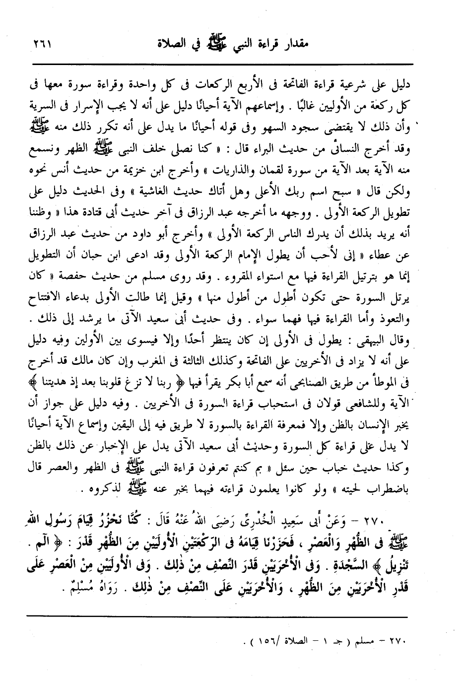 (270) - وَعَنْ أَبِي سَعِيدٍ الْخُدْرِيِّ - رَضِيَ اللَّهُ عَنْهُ - قَالَ: «كُنَّا نَحْزِرُ قِيَامَ رَسُولِ اللَّهِ - صَلَّى اللَّهُ عَلَيْهِ وَسَلَّمَ - فِي الظُّهْرِ وَالْعَصْرِ، فَحَزَرْنَا قِيَامَهُ فِي الرَّكْعَتَيْنِ الْأُولَيَيْنِ مِنْ الظُّهْرِ قَدْرَ: {الم - تَنْزِيلُ} [السجدة: 1 - 2] السَّجْدَةُ. وَفِي الْأُخْرَيَيْنِ قَدْرَ النِّصْفِ مِنْ ذَلِكَ. وَفِي الْأُولَيَيْنِ مِنْ الْعَصْرِ عَلَى قَدْرِ الْأُخْرَيَيْنِ مِنْ الظُّهْرِ، وَالْأُخْرَيَيْنِ عَلَى النِّصْفِ مِنْ ذَلِكَ.» رَوَاهُ مُسْلِمٌ.