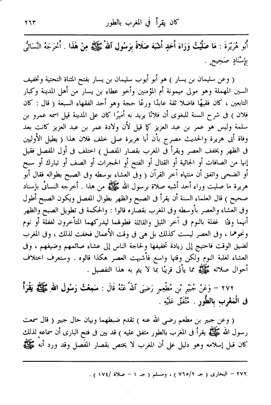 (272) - وَعَنْ جُبَيْرِ بْنِ مُطْعِمٍ - رَضِيَ اللَّهُ عَنْهُ - قَالَ: «سَمِعْت رَسُولَ اللَّهِ - صَلَّى اللَّهُ عَلَيْهِ وَسَلَّمَ - يَقْرَأُ فِي الْمَغْرِبِ بِالطُّورِ» . مُتَّفَقٌ عَلَيْهِ.