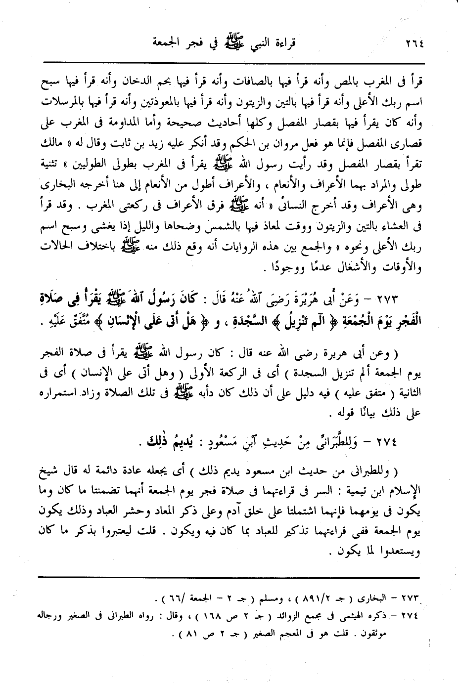 (274) - وَلِلطَّبَرَانِيِّ مِنْ حَدِيثِ ابْنِ مَسْعُودٍ: يُدِيمُ ذَلِكَ [وَلِلطَّبَرَانِيِّ مِنْ حَدِيثِ " ابْنِ مَسْعُودٍ "؛ يُدِيمُ ذَلِكَ] أَيْ يَجْعَلُهُ عَادَةً دَائِمَةً لَهُ. قَالَ شَيْخُ الْإِسْلَامِ ابْنُ تَيْمِيَّةَ السِّرُّ فِي قِرَاءَتِهِمَا فِي صَلَاةِ فَجْرِ يَوْمِ الْجُمُعَةِ أَنَّهُمَا تَضَمَّنَتَا مَا كَانَ وَمَا يَكُونُ يَوْمَهُمَا، فَإِنَّهُمَا اشْتَمَلَتَا عَلَى خَلْقِ آدَمَ، وَعَلَى ذِكْرِ الْمَعَادِ؛ وَحَشْرِ الْعِبَادِ، وَذَلِكَ يَكُونُ فِي يَوْمِ الْجُمُعَةِ، فَفِي قِرَاءَتِهِمَا تَذْكِيرٌ لِلْعِبَادِ بِمَا كَانَ فِيهِ وَيَكُونُ؛ قُلْت: لِيَعْتَبِرُوا بِذِكْرِ مَا كَانَ، وَيَسْتَعِدُّوا لِمَا يَكُونُ.