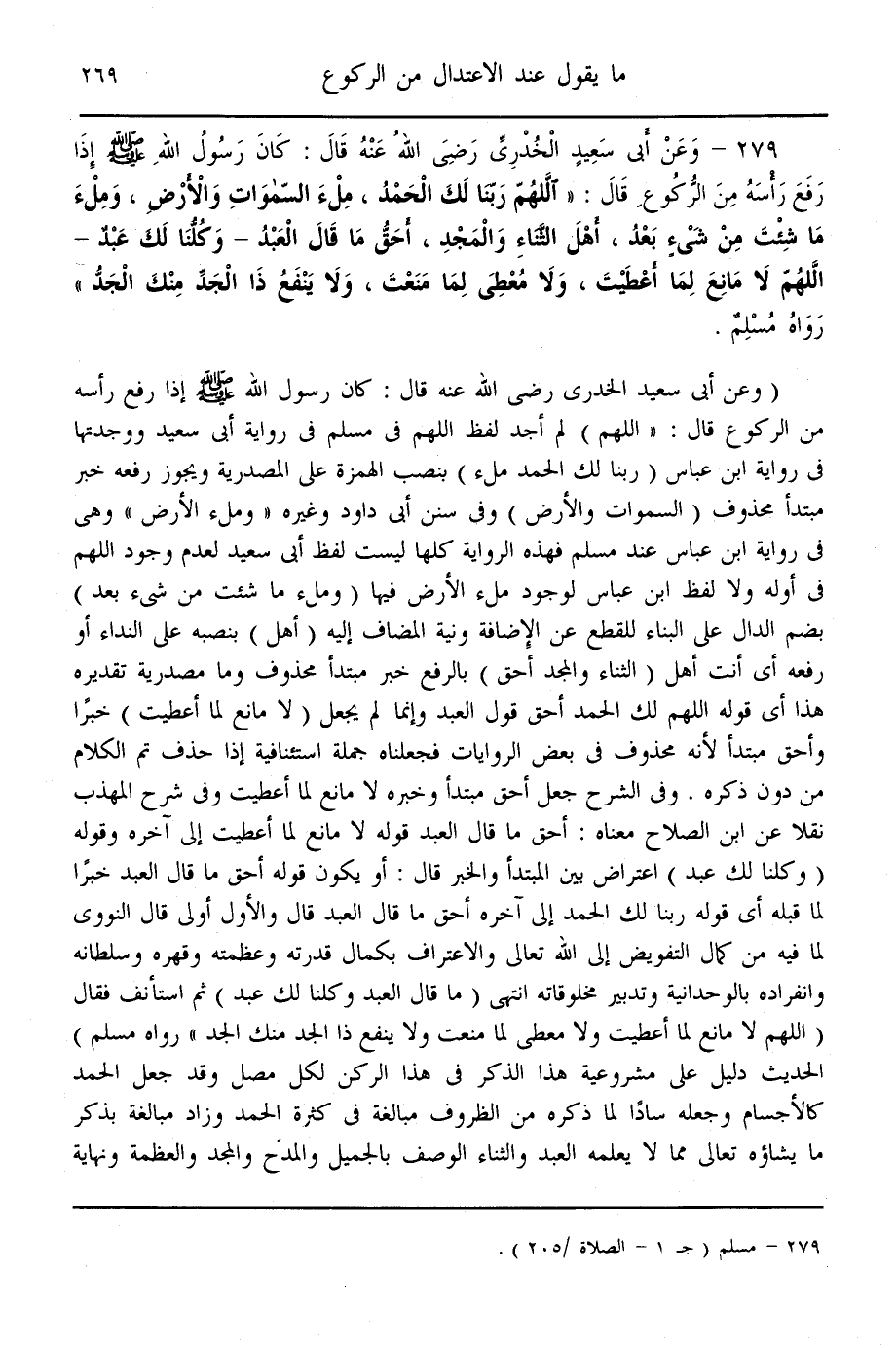 (279) - وَعَنْ أَبِي سَعِيدٍ الْخُدْرِيِّ - رَضِيَ اللَّهُ عَنْهُ - قَالَ: «كَانَ رَسُولُ اللَّهِ - صَلَّى اللَّهُ عَلَيْهِ وَسَلَّمَ - إذَا رَفَعَ رَأْسَهُ مِنْ الرُّكُوعِ قَالَ: اللَّهُمَّ رَبَّنَا لَك الْحَمْدُ، مِلْءَ السَّمَوَاتِ وَالْأَرْضِ، وَمِلْءَ مَا شِئْتَ مِنْ شَيْءٍ بَعْدُ، أَهْلَ الثَّنَاءِ وَالْمَجْدِ، أَحَقُّ مَا قَالَ الْعَبْدُ - وَكُلُّنَا لَكَ عَبْدٌ - اللَّهُمَّ لَا مَانِعَ لِمَا أَعْطَيْتَ، وَلَا مُعْطِيَ لِمَا مَنَعْتَ، وَلَا يَنْفَعُ ذَا الْجَدِّ مِنْكَ الْجَدُّ» رَوَاهُ مُسْلِمٌ.