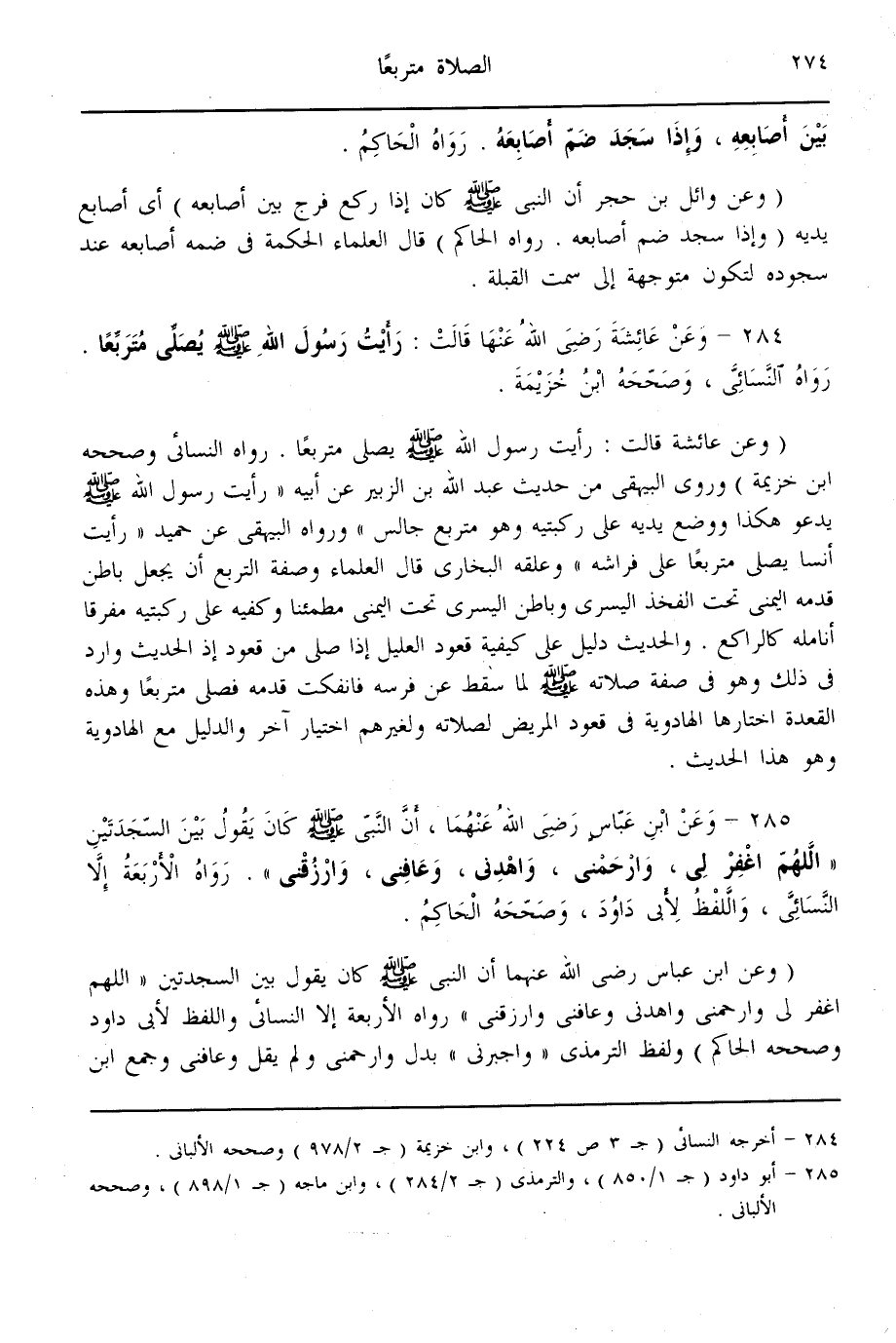 (284) - وَعَنْ عَائِشَةَ - رَضِيَ اللَّهُ عَنْهَا - قَالَتْ: «رَأَيْت رَسُولَ اللَّهِ - صَلَّى اللَّهُ عَلَيْهِ وَسَلَّمَ - يُصَلِّي مُتَرَبِّعًا» . رَوَاهُ النَّسَائِيّ، وَصَحَّحَهُ ابْنُ خُزَيْمَةَ.