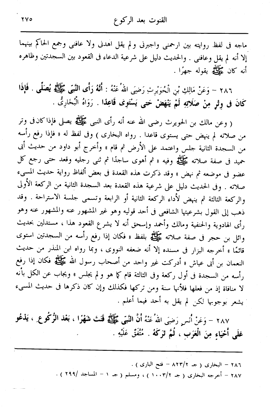 (286) - وَعَنْ مَالِكِ بْنِ الْحُوَيْرِثِ - رَضِيَ اللَّهُ عَنْهُ -: أَنَّهُ «رَأَى النَّبِيَّ - صَلَّى اللَّهُ عَلَيْهِ وَسَلَّمَ - يُصَلِّي. فَإِذَا كَانَ فِي وِتْرٍ مِنْ صَلَاتِهِ لَمْ يَنْهَضْ حَتَّى يَسْتَوِيَ قَاعِدًا.» رَوَاهُ الْبُخَارِيُّ.