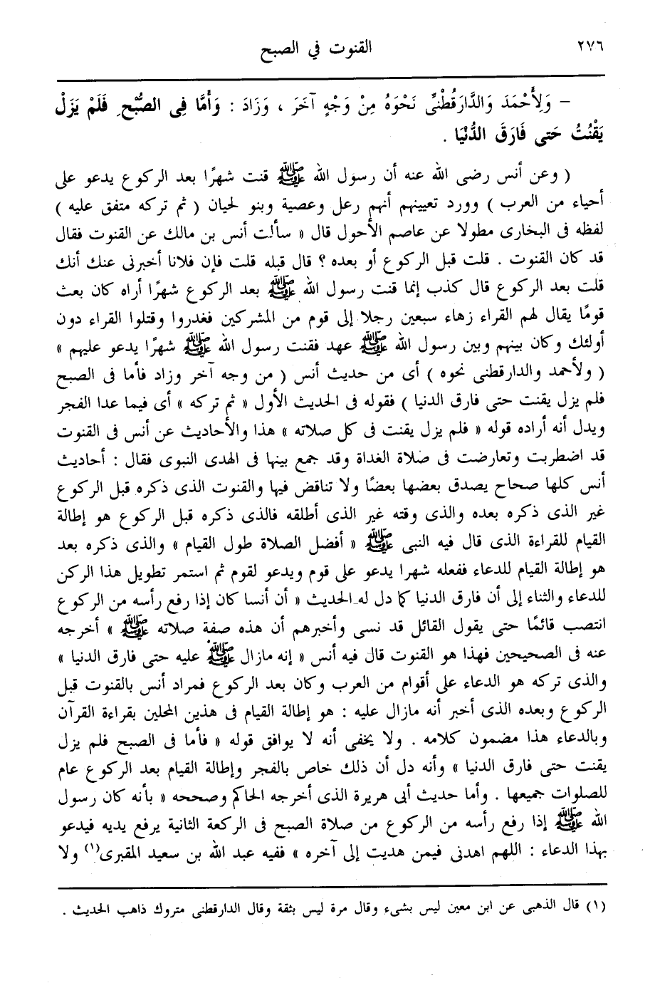 هَذَا، وَالْأَحَادِيثُ عَنْ " أَنَسٍ " فِي الْقُنُوتِ قَدْ اضْطَرَبَتْ وَتَعَارَضَتْ فِي صَلَاةِ الْغَدَاةِ، وَقَدْ جَمَعَ بَيْنَهَا فِي الْهَدْيِ النَّبَوِيِّ، فَقَالَ: أَحَادِيثُ " أَنَسٍ " كُلُّهَا صِحَاحٌ، يُصَدِّقُ بَعْضُهَا بَعْضَهَا وَلَا تَنَاقُضَ فِيهَا، وَالْقُنُوتُ الَّذِي ذَكَرَهُ قَبْلَ الرُّكُوعِ غَيْرُ الَّذِي ذَكَرَهُ بَعْدَهُ، وَاَلَّذِي وَقَّتَهُ غَيْرُ الَّذِي أَطْلَقَهُ، فَاَلَّذِي ذَكَرَهُ قَبْلَ الرُّكُوعِ هُوَ إطَالَةُ الْقِيَامِ لِلْقِرَاءَةِ الَّذِي قَالَ فِيهِ النَّبِيُّ - صَلَّى اللَّهُ عَلَيْهِ وَسَلَّمَ -: «أَفْضَلُ الصَّلَاةِ طُولُ الْقِيَامِ» وَاَلَّذِي ذَكَرَهُ بَعْدُ هُوَ إطَالَةُ الْقِيَامِ لِلدُّعَاءِ، فَفَعَلَهُ شَهْرًا يَدْعُو عَلَى قَوْمٍ، وَيَدْعُو لِقَوْمٍ، ثُمَّ اسْتَمَرَّ تَطْوِيلُ هَذَا الرُّكْنِ لِلدُّعَاءِ وَالثَّنَاءِ، إلَى أَنْ فَارَقَ الدُّنْيَا، كَمَا دَلَّ لَهُ الْحَدِيثُ: " أَنَّ «أَنَسًا كَانَ إذَا رَفَعَ رَأْسَهُ مِنْ الرُّكُوعِ انْتَصَبَ قَائِمًا حَتَّى يَقُولَ الْقَائِلُ: قَدْ نَسِيَ، وَأَخْبَرَهُمْ أَنَّ هَذِهِ صِفَةُ صَلَاتِهِ - صَلَّى اللَّهُ عَلَيْهِ وَسَلَّمَ -» أَخْرَجَهُ عَنْهُ فِي الصَّحِيحَيْنِ. فَهَذَا هُوَ الْقُنُوتُ الَّذِي قَالَ فِيهِ " أَنَسٌ ": «إنَّهُ مَا زَالَ - صَلَّى اللَّهُ عَلَيْهِ وَسَلَّمَ - عَلَيْهِ حَتَّى فَارَقَ الدُّنْيَا» وَاَلَّذِي تَرَكَهُ هُوَ الدُّعَاءُ عَلَى أَقْوَامٍ مِنْ الْعَرَبِ، وَكَانَ بَعْدَ الرُّكُوعِ، فَمُرَادُ " أَنَسٍ " بِالْقُنُوتِ قَبْلَ الرُّكُوعِ وَبَعْدَهُ الَّذِي أَخْبَرَ أَنَّهُ مَا زَالَ عَلَيْهِ؛ هُوَ إطَالَةُ الْقِيَامِ فِي هَذَيْنِ الْمَحَلَّيْنِ، بِقِرَاءَةِ الْقُرْآنِ وَبِالدُّعَاءِ، هَذَا مَضْمُونُ كَلَامِهِ.