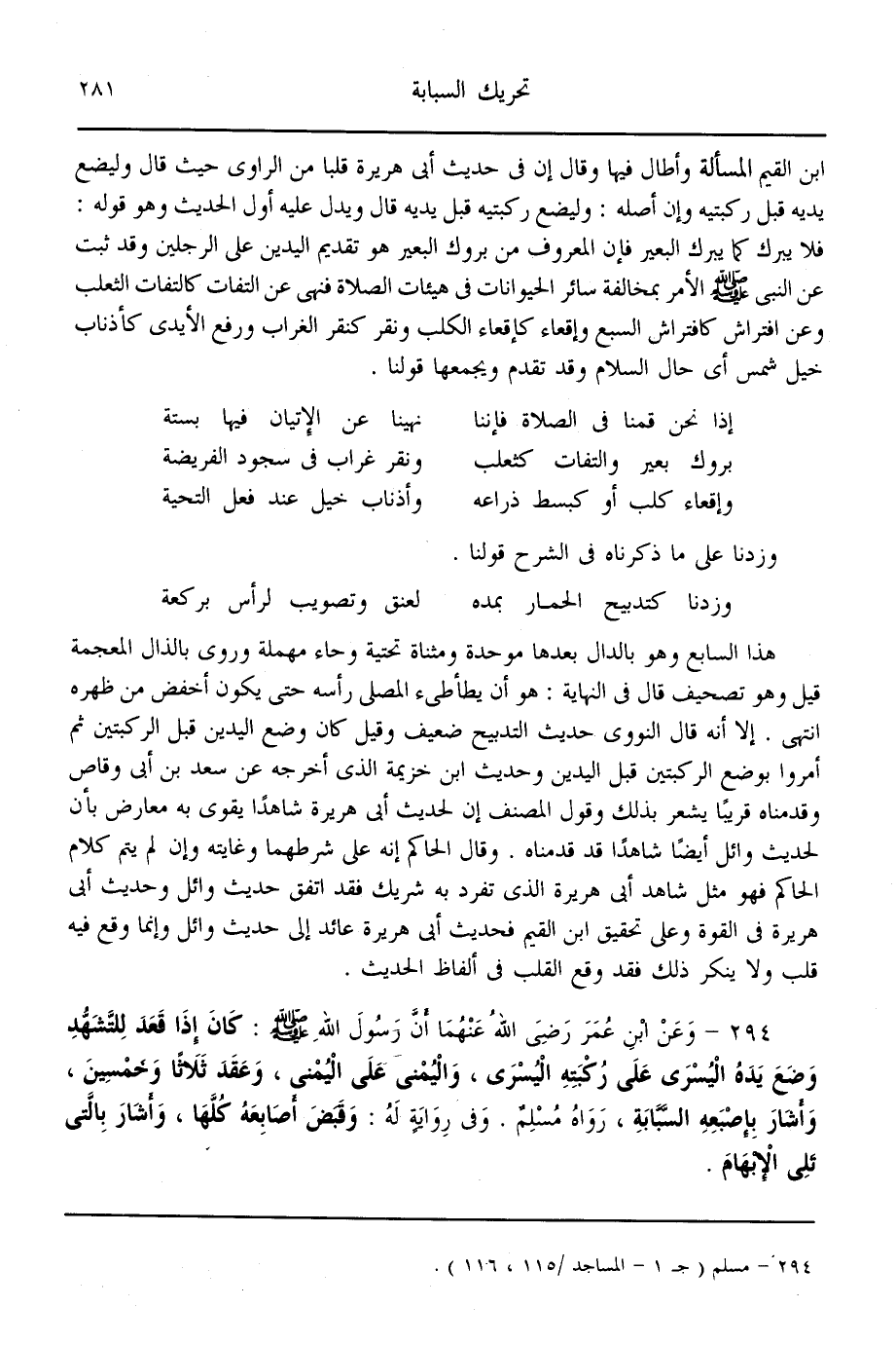 ـــــــــــــــــــــــــــــQابْنُ الْقَيِّمِ وَأَطَالَ فِيهَا وَقَالَ: إنَّ فِي حَدِيثِ " أَبِي هُرَيْرَةَ " قَلْبًا مِنْ الرَّاوِي، حَيْثُ قَالَ: " وَلْيَضَعْ يَدَيْهِ قَبْلَ رُكْبَتَيْهِ " وَإِنَّ أَصْلَهُ: " وَلْيَضَعْ رُكْبَتَيْهِ قَبْلَ يَدَيْهِ "، قَالَ: وَيَدُلُّ عَلَيْهِ أَوَّلُ الْحَدِيثِ، وَهُوَ قَوْلُهُ: " فَلَا يَبْرُكُ كَمَا يَبْرُكُ الْبَعِيرُ " فَإِنَّ الْمَعْرُوفَ مِنْ بُرُوكِ الْبَعِيرِ هُوَ تَقْدِيمُ الْيَدَيْنِ عَلَى الرِّجْلَيْنِ، وَقَدْ ثَبَتَ عَنْ النَّبِيِّ - صَلَّى اللَّهُ عَلَيْهِ وَسَلَّمَ - الْأَمْرُ بِمُخَالَفَةِ سَائِرِ الْحَيَوَانَاتِ فِي هَيْئَاتِ الصَّلَاةِ، فَنَهَى عَنْ الْتِفَاتٍ كَالْتِفَاتِ الثَّعْلَبِ، وَعَنْ افْتِرَاشٍ كَافْتِرَاشِ السَّبُعُ، وَإِقْعَاءٍ كَإِقْعَاءِ الْكَلْبِ، وَنَقْرٍ كَنَقْرٍ الْغُرَابِ، وَرَفْعِ الْأَيْدِي كَأَذْنَابِ خَيْلِ شَمْسٍ، أَيْ حَالَ السَّلَامِ، وَقَدْ تَقَدَّمَ، وَيَجْمَعُهَا قَوْلُنَا: