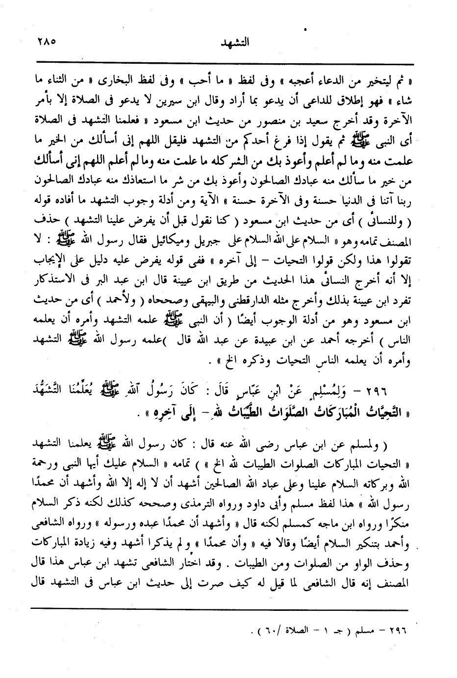 (296) - وَلِمُسْلِمٍ عَنْ ابْنِ عَبَّاسٍ قَالَ: «كَانَ رَسُولُ اللَّهِ - صَلَّى اللَّهُ عَلَيْهِ وَسَلَّمَ - يُعَلِّمُنَا التَّشَهُّدَ التَّحِيَّاتُ الْمُبَارَكَاتُ الصَّلَوَاتُ الطَّيِّبَاتُ لِلَّهِ - إلَى آخِرِهِ» .