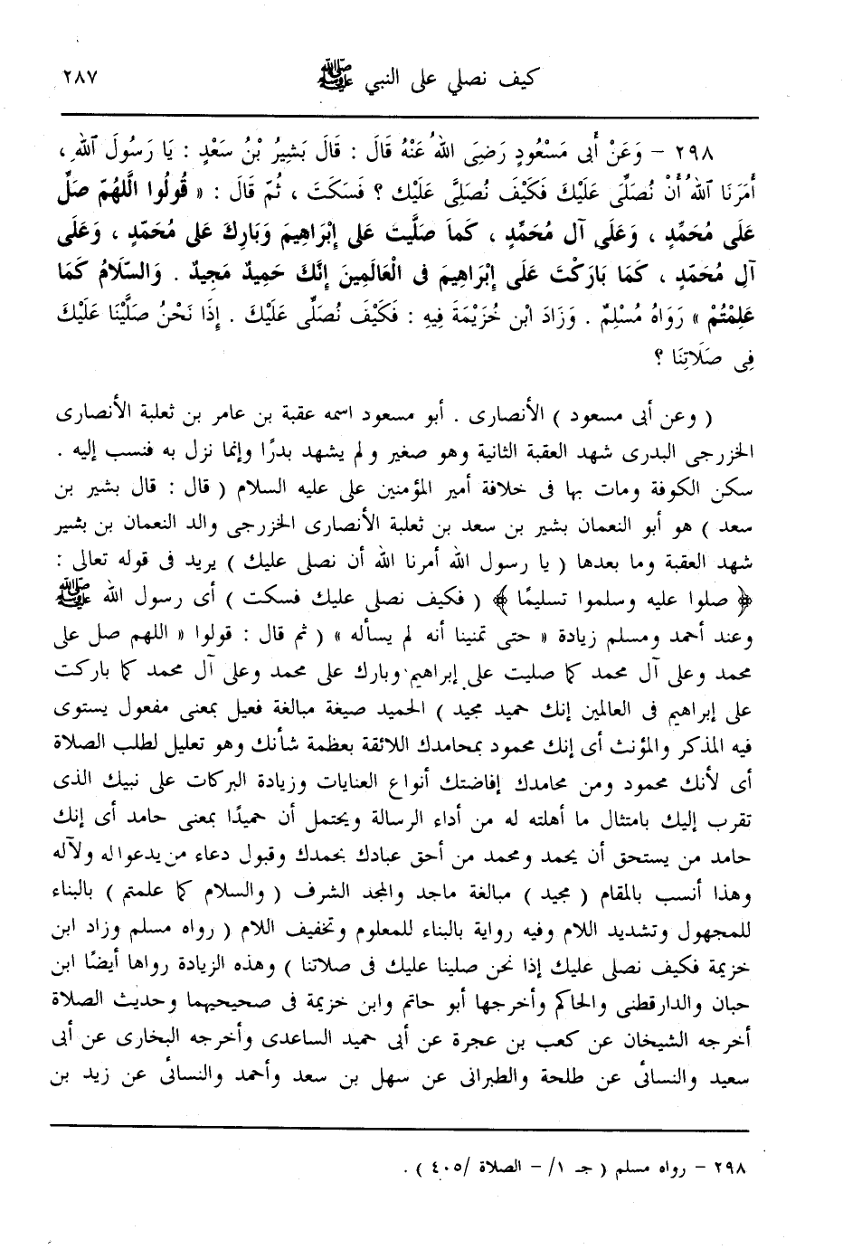 (298) - وَعَنْ أَبِي مَسْعُودٍ - رَضِيَ اللَّهُ عَنْهُ - قَالَ: «قَالَ بَشِيرُ بْنُ سَعْدٍ: يَا رَسُولَ اللَّهِ، أَمَرَنَا اللَّهُ أَنْ نُصَلِّيَ عَلَيْك فَكَيْفَ نُصَلِّي عَلَيْك؟ فَسَكَتَ، ثُمَّ قَالَ: قُولُوا اللَّهُمَّ صَلِّ عَلَى مُحَمَّدٍ، وَعَلَى آلِ مُحَمَّدٍ، كَمَا صَلَّيْت عَلَى إبْرَاهِيمَ وَبَارِكْ عَلَى مُحَمَّدٍ، وَعَلَى آلِ مُحَمَّدٍ، كَمَا بَارَكْت عَلَى إبْرَاهِيمَ فِي الْعَالَمِينَ إنَّك حَمِيدٌ مَجِيدٌ. وَالسَّلَامُ كَمَا عَلِمْتُمْ» رَوَاهُ مُسْلِمٌ. وَزَادَ ابْنُ خُزَيْمَةَ فِيهِ: فَكَيْفَ نُصَلِّي عَلَيْك إذَا نَحْنُ صَلَّيْنَا عَلَيْك فِي صَلَاتِنَا؟ .