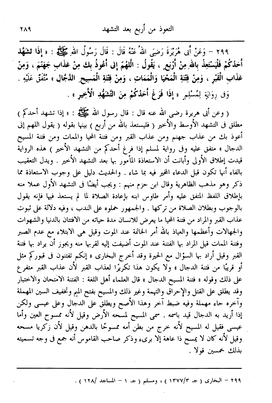 (299) - وَعَنْ أَبِي هُرَيْرَةَ - رَضِيَ اللَّهُ عَنْهُ - قَالَ: قَالَ رَسُولُ اللَّهِ - صَلَّى اللَّهُ عَلَيْهِ وَسَلَّمَ -: «إذَا تَشَهَّدَ أَحَدُكُمْ فَلْيَسْتَعِذْ بِاَللَّهِ مِنْ أَرْبَعٍ، يَقُولُ: اللَّهُمَّ إنِّي أَعُوذُ بِك مِنْ عَذَابِ جَهَنَّمِ، وَمِنْ عَذَابِ الْقَبْرِ، وَمِنْ فِتْنَةِ الْمَحْيَا وَالْمَمَاتِ، وَمِنْ فِتْنَةِ الْمَسِيحِ الدَّجَّالِ» مُتَّفَقٌ عَلَيْهِ. وَفِي رِوَايَةٍ لِمُسْلِمٍ " إذَا فَرَغَ أَحَدُكُمْ مِنْ التَّشَهُّدِ الْأَخِيرِ ".