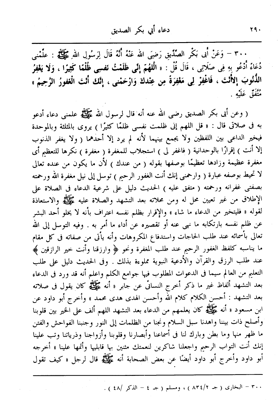 (300) - «وَعَنْ أَبِي بَكْرٍ الصِّدِّيقِ - رَضِيَ اللَّهُ عَنْهُ - أَنَّهُ قَالَ لِرَسُولِ اللَّهِ - صَلَّى اللَّهُ عَلَيْهِ وَسَلَّمَ -: عَلِّمْنِي دُعَاءً أَدْعُو بِهِ فِي صَلَاتِي، قَالَ قُلْ: اللَّهُمَّ إنِّي ظَلَمْت نَفْسِي ظُلْمًا كَثِيرًا، وَلَا يَغْفِرُ الذُّنُوبَ إلَّا أَنْتَ، فَاغْفِرْ لِي مَغْفِرَةً مِنْ عِنْدِك وَارْحَمْنِي، إنَّك أَنْتَ الْغَفُورُ الرَّحِيمُ» مُتَّفَقٌ عَلَيْهِ.
