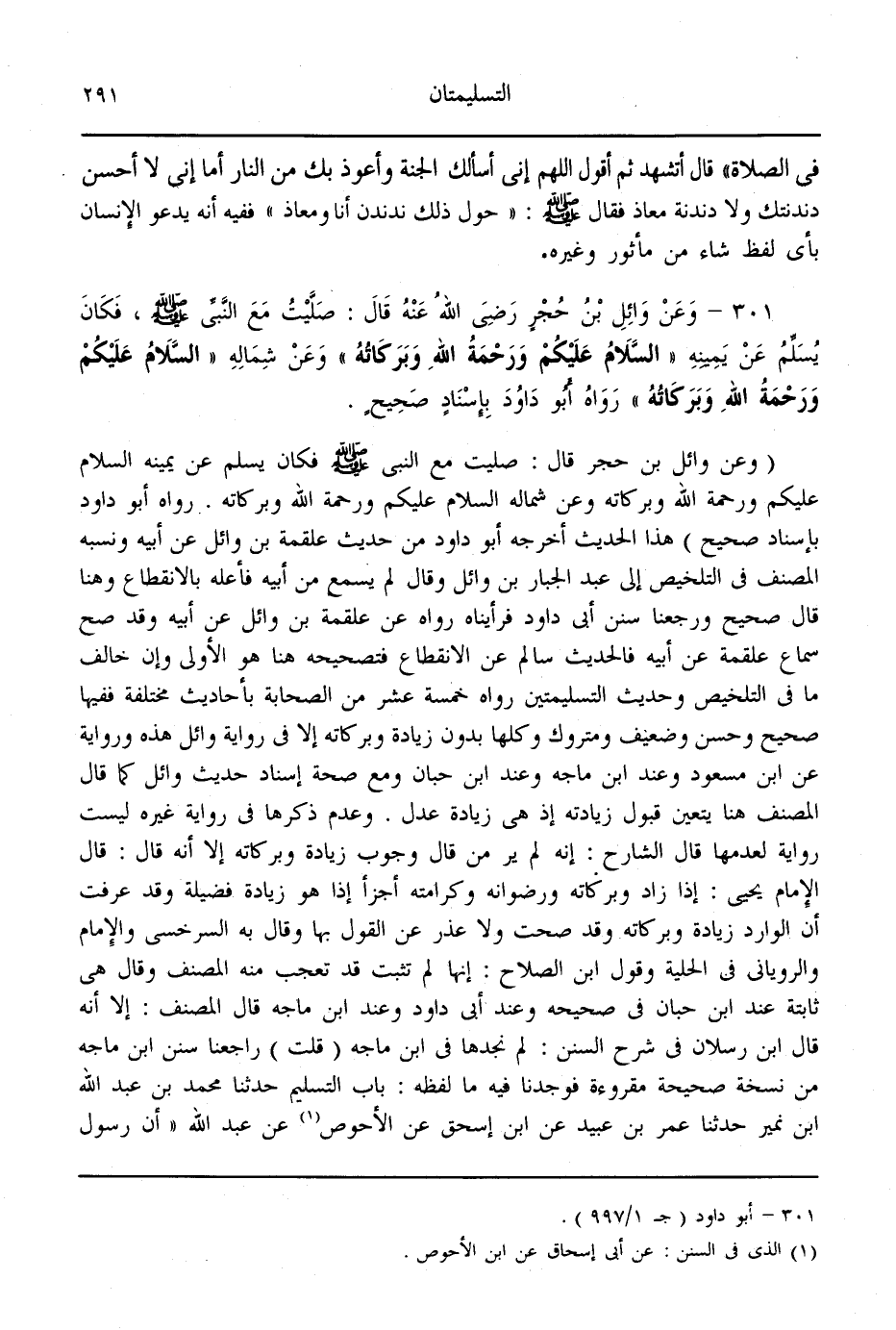 (301) - وَعَنْ وَائِلِ بْنِ حُجْرٍ - رَضِيَ اللَّهُ عَنْهُ - قَالَ: «صَلَّيْت مَعَ النَّبِيِّ - صَلَّى اللَّهُ عَلَيْهِ وَسَلَّمَ -، فَكَانَ يُسَلِّمُ عَنْ يَمِينِهِ السَّلَامُ عَلَيْكُمْ وَرَحْمَةُ اللَّهِ وَبَرَكَاتُهُ وَعَنْ شِمَالِهِ السَّلَامُ عَلَيْكُمْ وَرَحْمَةُ اللَّهِ وَبَرَكَاتُهُ» رَوَاهُ أَبُو دَاوُد بِإِسْنَادٍ صَحِيحٍ.