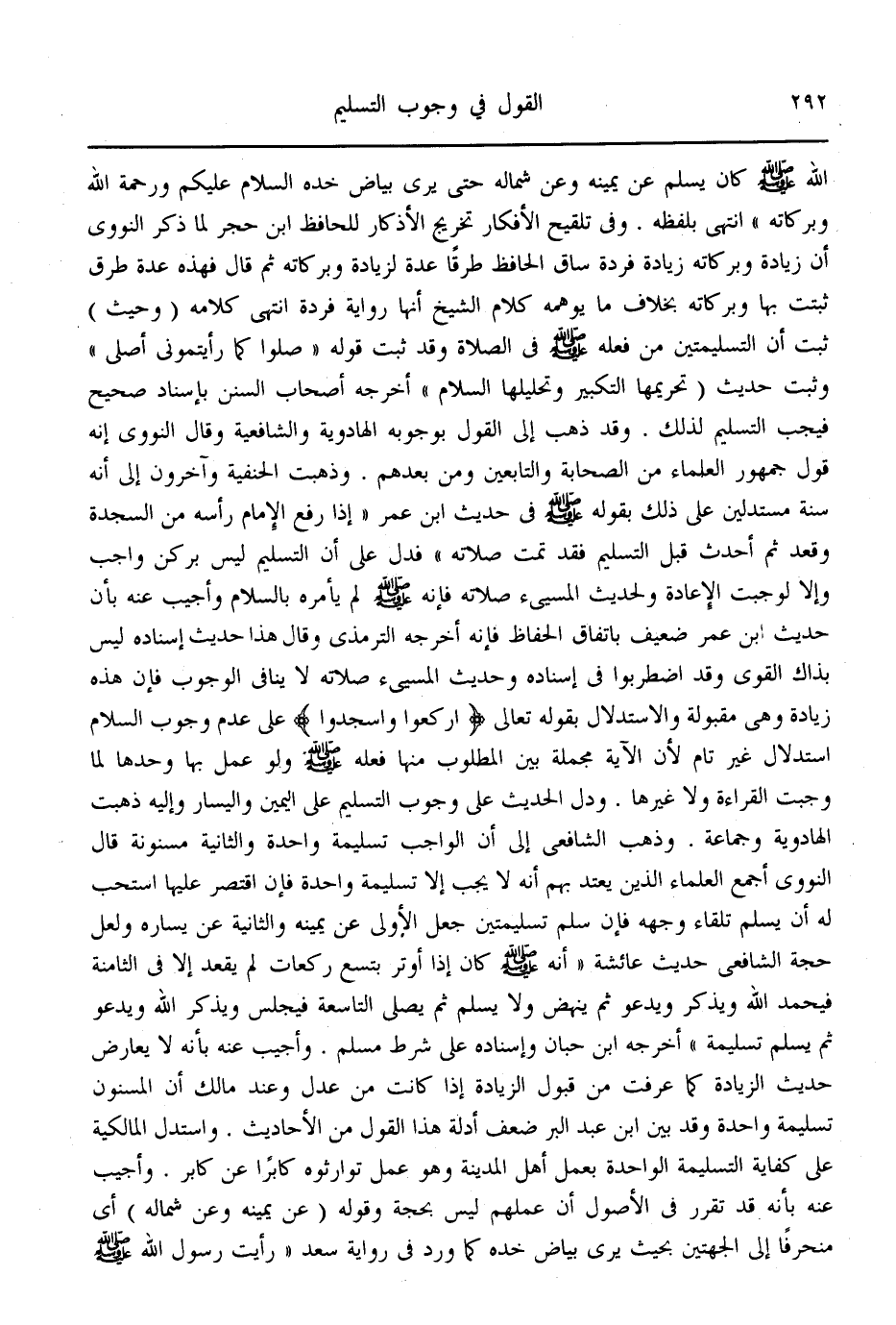 ـــــــــــــــــــــــــــــQ- صَلَّى اللَّهُ عَلَيْهِ وَسَلَّمَ - كَانَ يُسَلِّمُ عَنْ يَمِينِهِ وَعَنْ شِمَالِهِ حَتَّى يُرَى بَيَاضُ خَدِّهِ: السَّلَامُ عَلَيْكُمْ وَرَحْمَةُ اللَّهِ وَبَرَكَاتُهُ» انْتَهَى بِلَفْظِهِ.