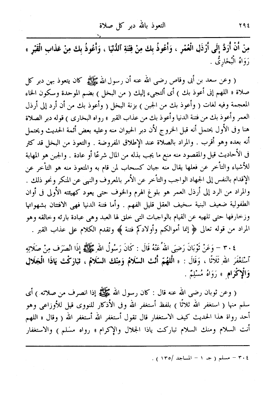 (304) - وَعَنْ ثَوْبَانَ - رَضِيَ اللَّهُ عَنْهُ - قَالَ: «كَانَ رَسُولُ اللَّهِ - صَلَّى اللَّهُ عَلَيْهِ وَسَلَّمَ - إذَا انْصَرَفَ مِنْ صَلَاتِهِ اسْتَغْفَرَ اللَّهَ ثَلَاثًا، وَقَالَ: اللَّهُمَّ أَنْتَ السَّلَامُ وَمِنْك السَّلَامُ، تَبَارَكْتَ يَا ذَا الْجَلَالِ وَالْإِكْرَامِ» رَوَاهُ مُسْلِمٌ.