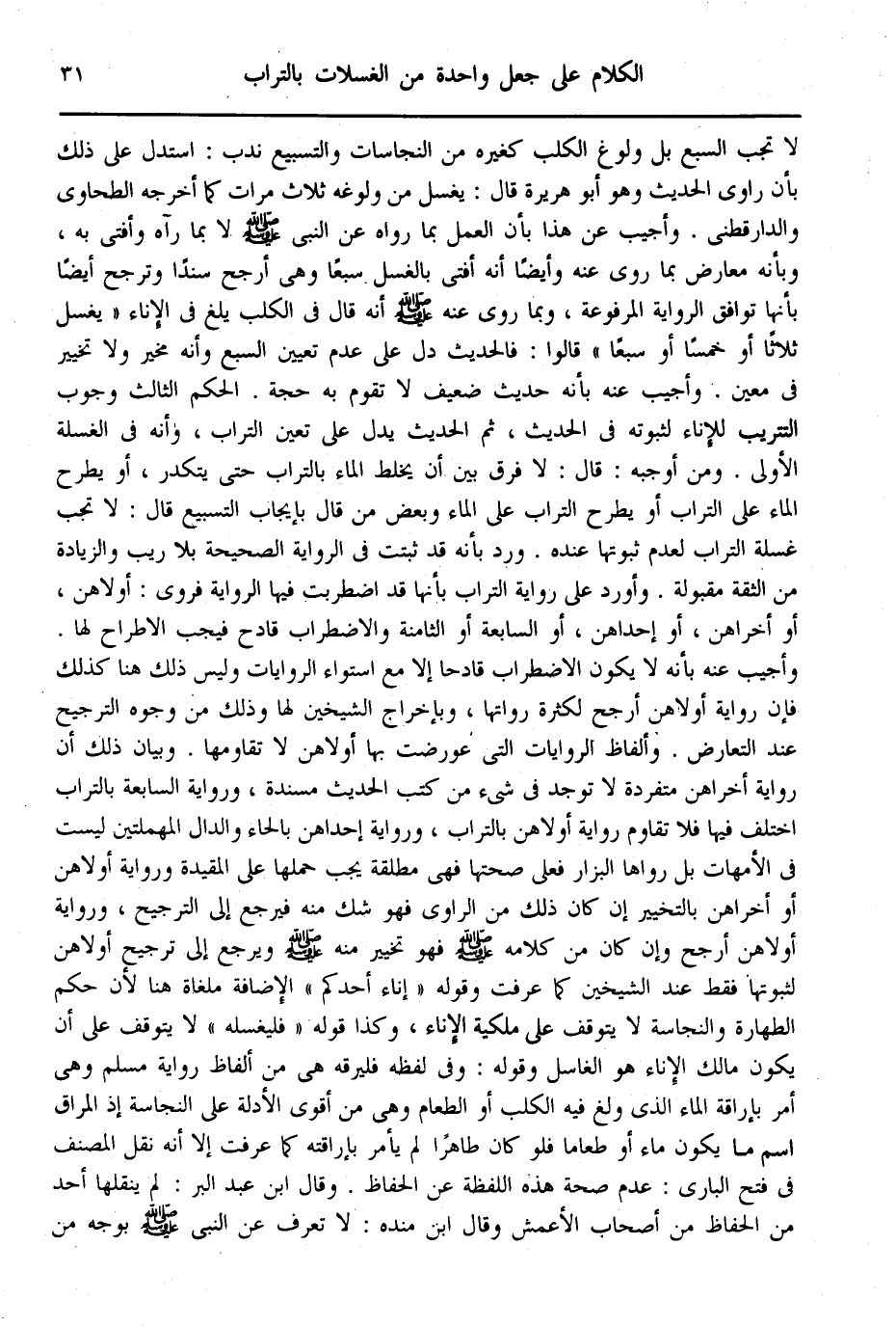 الْحُكْمُ الثَّالِثُ: وُجُوبُ التَّتْرِيبِ لِلْإِنَاءِ لِثُبُوتِهِ فِي الْحَدِيثِ، ثُمَّ الْحَدِيثُ يَدُلُّ عَلَى تَعَيُّنِ التُّرَابِ، وَأَنَّهُ فِي الْغَسْلَةِ الْأُولَى؛ وَمَنْ أَوْجَبَهُ قَالَ: لَا فَرْقَ بَيْنَ أَنْ يَخْلِطَ الْمَاءَ بِالتُّرَابِ حَتَّى يَتَكَدَّرَ، أَوْ يَطْرَحَ الْمَاءَ عَلَى التُّرَابِ، أَوْ يَطْرَحَ التُّرَابَ عَلَى الْمَاءِ، وَبَعْضُ مَنْ قَالَ بِإِيجَابِ التَّسْبِيعِ، قَالَ: لَا تَجِبُ غَسْلَةُ التُّرَابِ لِعَدَمِ ثُبُوتِهَا عِنْدَهُ. وَرَدَّ: بِأَنَّهَا قَدْ ثَبَتَتْ فِي الرِّوَايَةِ الصَّحِيحَةِ بِلَا رَيْبٍ، وَالزِّيَادَةُ مِنْ الثِّقَةِ مَقْبُولَةٌ، وَأَوْرَدَ عَلَى رِوَايَةِ التُّرَابِ بِأَنَّهَا قَدْ اضْطَرَبَتْ فِيهَا الرِّوَايَةُ، فَرَوَى أُولَاهُنَّ، أَوْ أُخْرَاهُنَّ، أَوْ إحْدَاهُنَّ، أَوْ السَّابِعَةُ، أَوْ الثَّامِنَةُ، وَالِاضْطِرَابُ قَادِحٌ، فَيَجِبُ الْإِطْرَاحُ لَهَا.