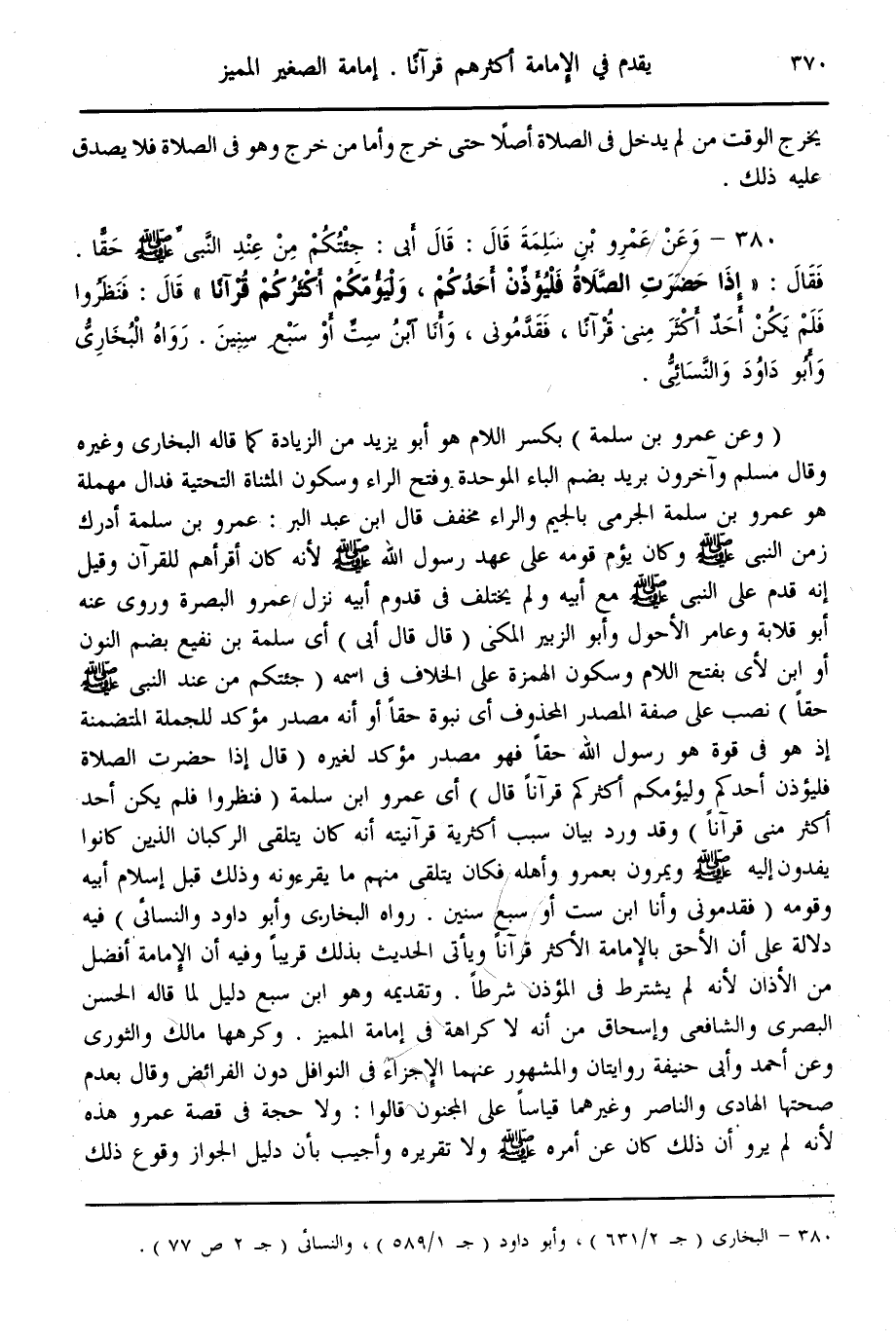 (380) - وَعَنْ «عَمْرِو بْنِ سَلَمَةَ قَالَ: قَالَ أَبِي: جِئْتُكُمْ مِنْ عِنْدِ النَّبِيِّ - صَلَّى اللَّهُ عَلَيْهِ وَسَلَّمَ - حَقًّا. فَقَالَ: إذَا حَضَرَتْ الصَّلَاةُ فَلْيُؤَذِّنْ أَحَدُكُمْ، وَلْيَؤُمَّكُمْ أَكْثَرُكُمْ قُرْآنًا قَالَ: فَنَظَرُوا فَلَمْ يَكُنْ أَحَدٌ أَكْثَرَ مِنِّي قُرْآنًا، فَقَدَّمُونِي، وَأَنَا ابْنُ سِتٍّ أَوْ سَبْعِ سِنِينَ» رَوَاهُ الْبُخَارِيُّ وَأَبُو دَاوُد وَالنَّسَائِيُّ.