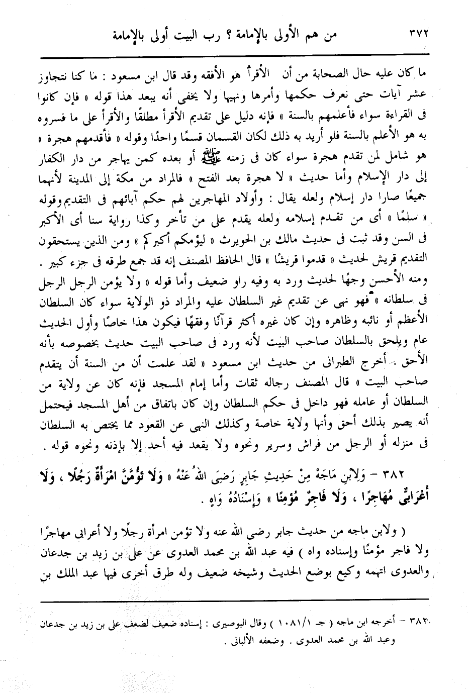 (382) - وَلِابْنِ مَاجَهْ مِنْ حَدِيثِ جَابِرٍ - رَضِيَ اللَّهُ عَنْهُ - «، وَلَا تَؤُمَّنَّ امْرَأَةٌ رَجُلًا، وَلَا أَعْرَابِيٌّ مُهَاجِرًا، وَلَا فَاجِرٌ مُؤْمِنًا» ، وَإِسْنَادُهُ وَاهٍ