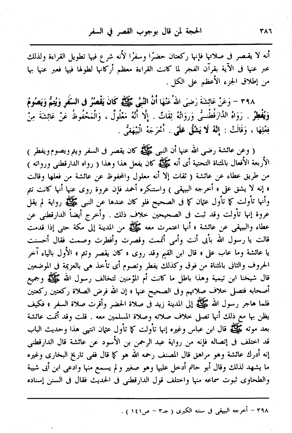 (398) - وَعَنْ عَائِشَةَ - رَضِيَ اللَّهُ عَنْهَا - «أَنَّ النَّبِيَّ - صَلَّى اللَّهُ عَلَيْهِ وَسَلَّمَ - كَانَ يَقْصُرُ فِي السَّفَرِ وَيُتِمُّ وَيَصُومُ وَيُفْطِرُ» رَوَاهُ الدَّارَقُطْنِيُّ وَرُوَاتُهُ ثِقَاتٌ. إلَّا أَنَّهُ مَعْلُولٌ، وَالْمَحْفُوظُ عَنْ عَائِشَةَ مِنْ فِعْلِهَا، وَقَالَتْ: إنَّهُ لَا يَشُقُّ عَلَيَّ. أَخْرَجَهُ الْبَيْهَقِيُّ
