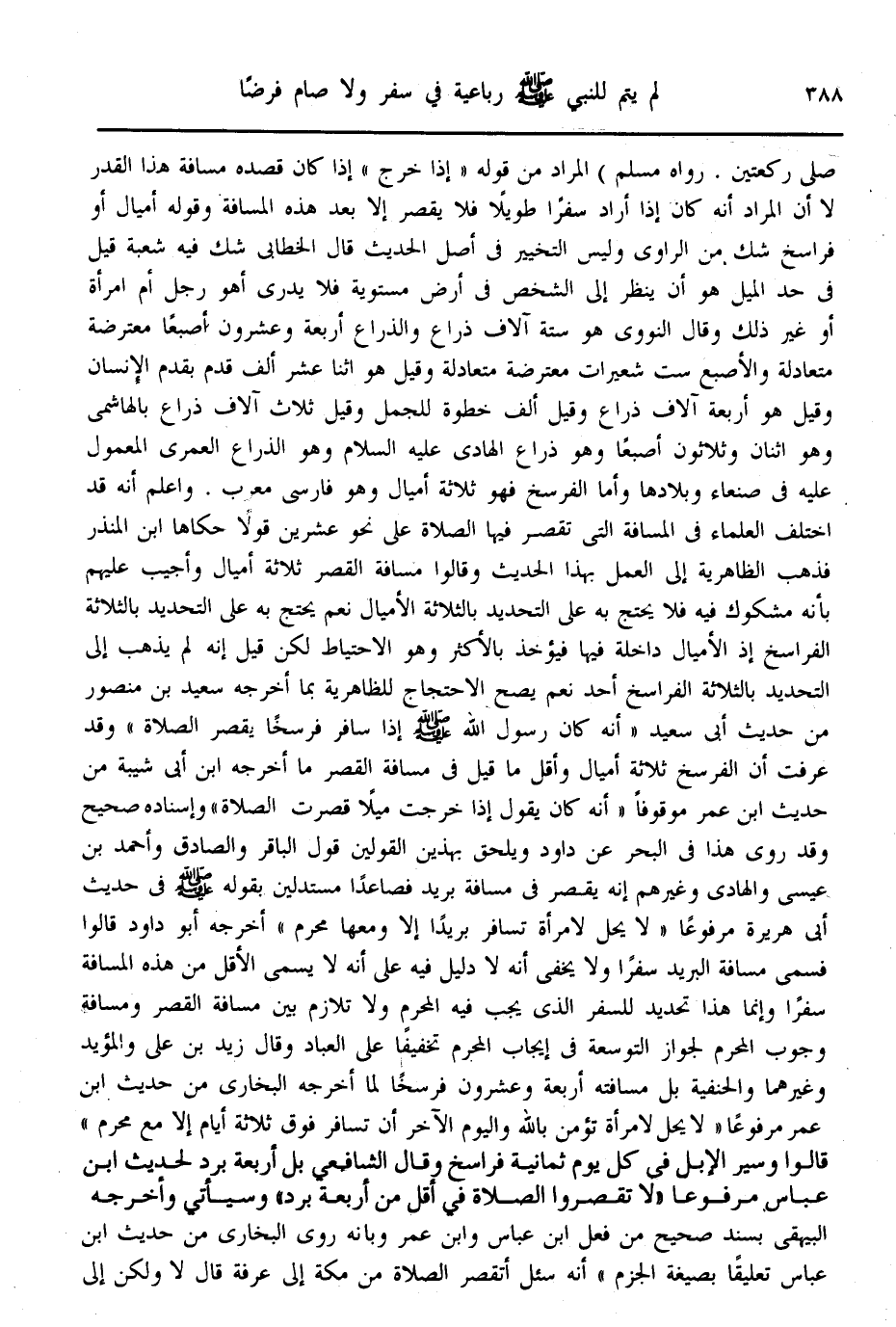الْمُرَادُ مِنْ قَوْلِهِ " إذَا خَرَجَ " إذَا كَانَ قَصْدُهُ مَسَافَةَ هَذَا الْقَدْرِ لَا أَنَّ الْمُرَادَ أَنَّهُ كَانَ إذَا أَرَادَ سَفَرًا طَوِيلًا فَلَا يَقْصُرُ إلَّا بَعْدَ هَذِهِ الْمَسَافَةِ وَقَوْلُهُ أَمْيَالٍ أَوْ فَرَاسِخَ شَكٌّ مِنْ الرَّاوِي وَلَيْسَ التَّخْيِيرُ فِي أَصْلِ الْحَدِيثِ قَالَ الْخَطَّابِيُّ شَكَّ فِيهِ شُعْبَةُ قِيلَ فِي حَدِّ الْمِيلِ هُوَ أَنْ يَنْظُرَ إلَى الشَّخْصِ فِي أَرْضٍ مُسْتَوِيَةٍ فَلَا يَدْرِي أَهُوَ رَجُلٌ أَوْ امْرَأَةٌ أَوْ غَيْرُ ذَلِكَ وَقَالَ النَّوَوِيُّ هُوَ سِتَّةُ آلَافِ ذِرَاعٍ وَالذِّرَاعُ أَرْبَعَةٌ وَعِشْرُونَ أُصْبُعًا مُعْتَرِضَةً مُتَعَادِلَةً، وَالْأُصْبُعُ سِتُّ شَعِيرَاتٍ مُعْتَرِضَةً مُتَعَادِلَةً، وَقِيلَ: هُوَ اثْنَا عَشَرَ أَلْفَ قَدَمٍ بِقَدَمِ الْإِنْسَانِ وَقِيلَ: هُوَ أَرْبَعَةُ آلَافِ ذِرَاعٍ، وَقِيلَ: أَلْفُ خُطْوَةٍ لِلْجَمَلِ وَقِيلَ: ثَلَاثُ آلَافِ ذِرَاعٍ بِالْهَاشِمِيِّ وَهُوَ اثْنَانِ وَثَلَاثُونَ أُصْبُعًا، وَهُوَ ذِرَاعُ الْهَادِي - عَلَيْهِ السَّلَامُ - وَهُوَ الذِّرَاعُ الْعُمَرِيُّ الْمَعْمُولُ عَلَيْهِ فِي صَنْعَاءَ وَبِلَادِهَا.