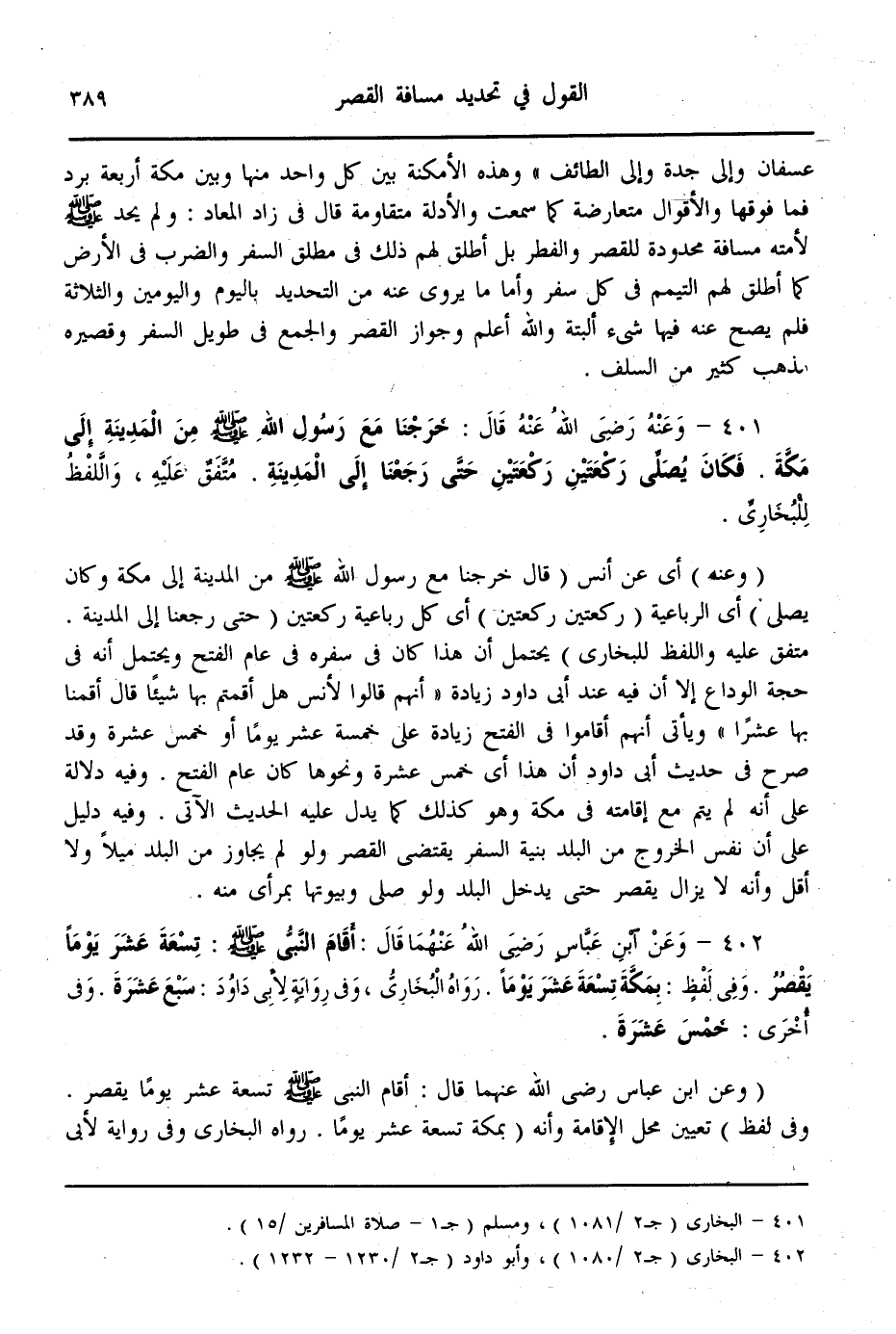 (402) - وَعَنْ ابْنِ عَبَّاسٍ - رَضِيَ اللَّهُ عَنْهُمَا - قَالَ: «أَقَامَ النَّبِيُّ - صَلَّى اللَّهُ عَلَيْهِ وَسَلَّمَ -: تِسْعَةَ عَشَرَ يَوْمًا يَقْصُرُ» ، وَفِي لَفْظٍ: بِمَكَّةَ تِسْعَةَ عَشَرَ يَوْمًا رَوَاهُ الْبُخَارِيُّ، وَفِي رِوَايَةٍ لِأَبِي دَاوُد: سَبْعَ عَشْرَةَ، وَفِي أُخْرَى: خَمْسَ عَشْرَةَ