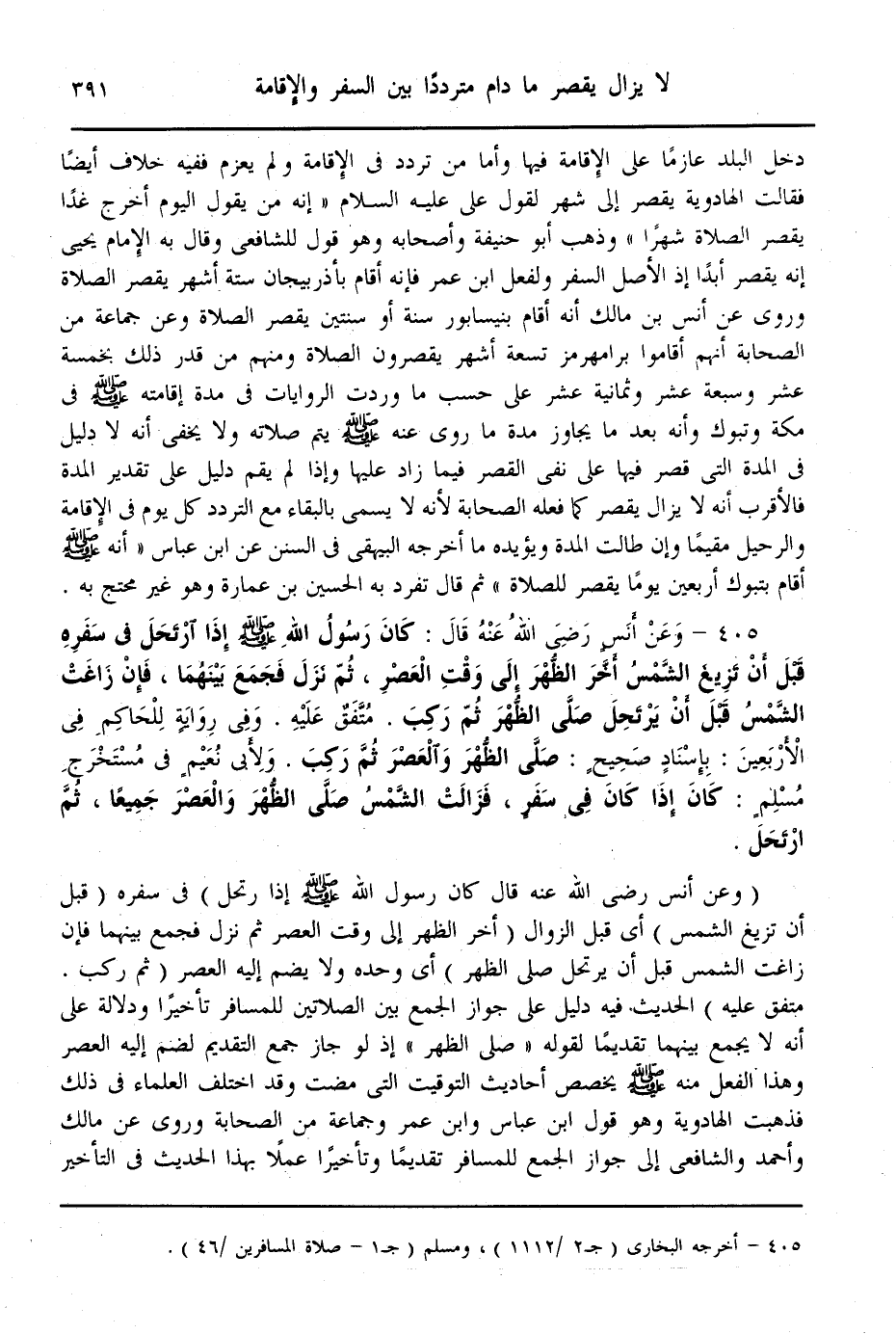 (405) - وَعَنْ أَنَسٍ - رَضِيَ اللَّهُ عَنْهُ - قَالَ: «كَانَ رَسُولُ اللَّهِ - صَلَّى اللَّهُ عَلَيْهِ وَسَلَّمَ - إذَا ارْتَحَلَ فِي سَفَرِهِ قَبْلَ أَنْ تَزِيغَ الشَّمْسُ أَخَّرَ الظُّهْرَ إلَى وَقْتِ الْعَصْرِ، ثُمَّ نَزَلَ فَجَمَعَ بَيْنَهُمَا، فَإِنْ زَاغَتْ الشَّمْسُ قَبْلَ أَنْ يَرْتَحِلَ صَلَّى الظُّهْرَ ثُمَّ رَكِبَ» مُتَّفَقٌ عَلَيْهِ. وَفِي رِوَايَةٍ لِلْحَاكِمِ فِي الْأَرْبَعِينَ: بِإِسْنَادٍ صَحِيحٍ: صَلَّى الظُّهْرَ، وَالْعَصْرَ ثُمَّ رَكِبَ. وَلِأَبِي نُعَيْمٍ فِي مُسْتَخْرَجِ مُسْلِمٍ: «كَانَ إذَا كَانَ فِي سَفَرٍ، فَزَالَتْ الشَّمْسُ صَلَّى الظُّهْرَ، وَالْعَصْرَ جَمِيعًا، ثُمَّ ارْتَحَلَ»