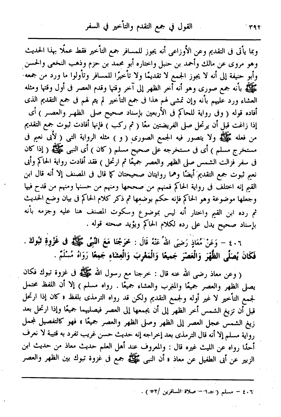 (406) - وَعَنْ مُعَاذٍ - رَضِيَ اللَّهُ عَنْهُ - قَالَ: «خَرَجْنَا مَعَ النَّبِيِّ - صَلَّى اللَّهُ عَلَيْهِ وَسَلَّمَ - فِي غَزْوَةِ تَبُوكَ. فَكَانَ يُصَلِّي الظُّهْرَ، وَالْعَصْرَ جَمِيعًا، وَالْمَغْرِبَ، وَالْعِشَاءَ جَمِيعًا» رَوَاهُ مُسْلِمٌ.