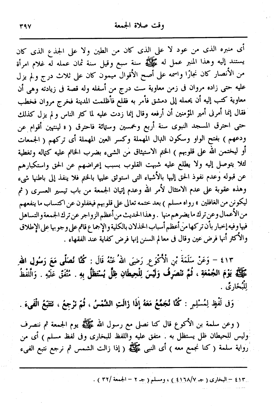 (413) - وَعَنْ سَلَمَةَ بْنِ الْأَكْوَعِ - رَضِيَ اللَّهُ عَنْهُ - قَالَ: «كُنَّا نُصَلِّي مَعَ رَسُولِ اللَّهِ - صَلَّى اللَّهُ عَلَيْهِ وَسَلَّمَ - يَوْمَ الْجُمُعَةِ، ثُمَّ نَنْصَرِفُ وَلَيْسَ لِلْحِيطَانِ ظِلٌّ يُسْتَظَلُّ بِهِ» مُتَّفَقٌ عَلَيْهِ، وَاللَّفْظُ لِلْبُخَارِيِّ. وَفِي لَفْظٍ لِمُسْلِمٍ: كُنَّا نَجْمَعُ مَعَهُ إذَا زَالَتْ الشَّمْسُ، ثُمَّ نَرْجِعُ، نَتَتَبَّعُ الْفَيْءَ