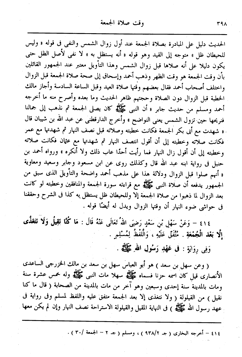 (414) - وَعَنْ سَهْلِ بْنِ سَعْدٍ - رَضِيَ اللَّهُ تَعَالَى عَنْهُ - قَالَ: مَا كُنَّا نَقِيلُ، وَلَا نَتَغَذَّى إلَّا بَعْدَ الْجُمُعَةِ. مُتَّفَقٌ عَلَيْهِ، وَاللَّفْظُ لِمُسْلِمٍ، وَفِي رِوَايَةٍ: فِي عَهْدِ رَسُولِ اللَّهِ - صَلَّى اللَّهُ عَلَيْهِ وَسَلَّمَ -