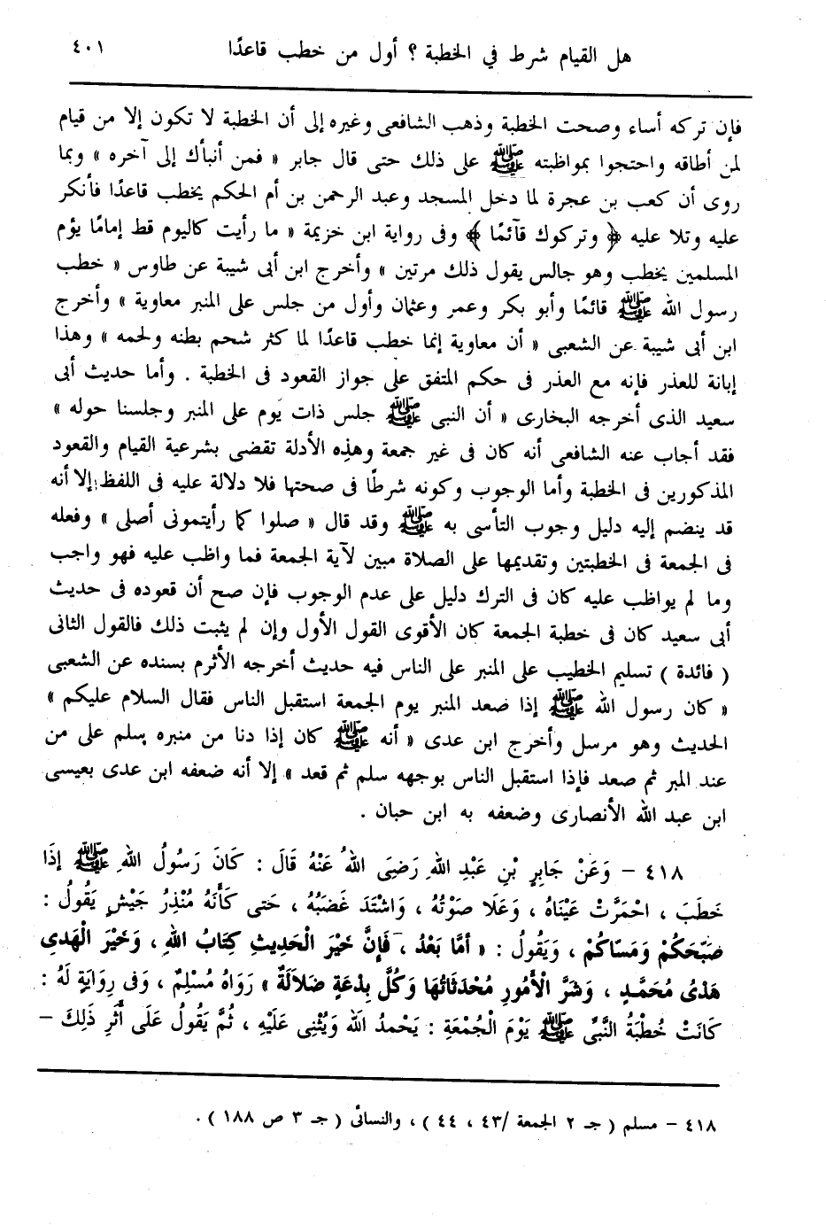 (418) - وَعَنْ جَابِرِ بْنِ عَبْدِ اللَّهِ - رَضِيَ اللَّهُ عَنْهُ - قَالَ: «كَانَ رَسُولُ اللَّهِ - صَلَّى اللَّهُ عَلَيْهِ وَسَلَّمَ - إذَا خَطَبَ، احْمَرَّتْ عَيْنَاهُ، وَعَلَا صَوْتُهُ، وَاشْتَدَّ غَضَبُهُ، حَتَّى كَأَنَّهُ مُنْذِرُ جَيْشٍ يَقُولُ: صَبَّحَكُمْ وَمَسَّاكُمْ، وَيَقُولُ: أَمَّا بَعْدُ، فَإِنَّ خَيْرَ الْحَدِيثِ كِتَابُ اللَّهِ، وَخَيْرَ الْهَدْيِ هَدْيُ مُحَمَّدٍ، وَشَرَّ الْأُمُورِ مُحْدَثَاتُهَا وَكُلَّ بِدْعَةٍ ضَلَالَةٌ» رَوَاهُ مُسْلِمٌ، وَفِي رِوَايَةٍ لَهُ: «كَانَتْ خُطْبَةُ النَّبِيِّ - صَلَّى اللَّهُ عَلَيْهِ وَسَلَّمَ - يَوْمَ الْجُمُعَةِ: يَحْمَدُ اللَّهَ وَيُثْنِي عَلَيْهِ، ثُمَّ يَقُولُ عَلَى أَثَرِ ذَلِكَ -