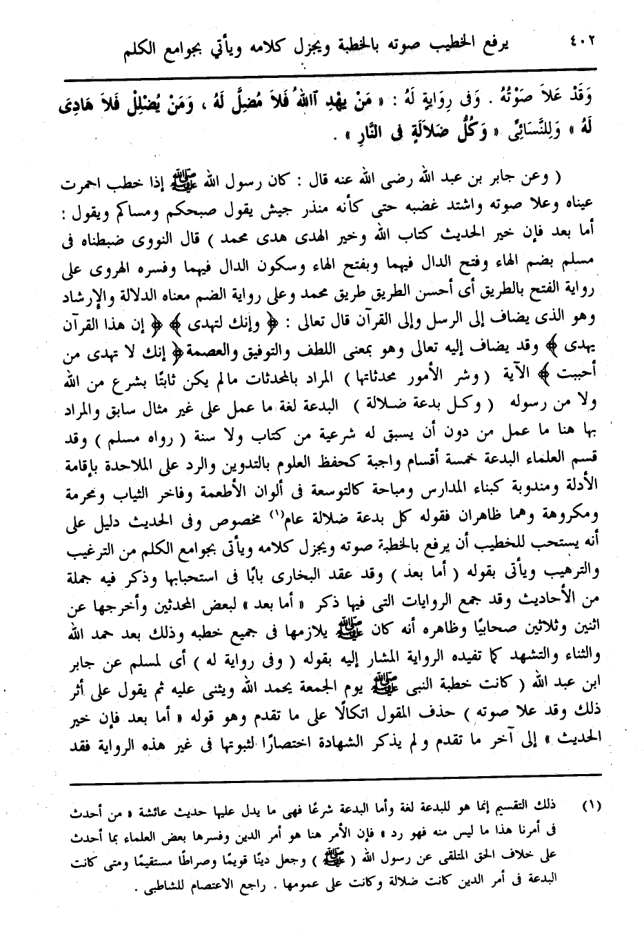 وَعَنْ جَابِرِ بْنِ عَبْدِ اللَّهِ - رَضِيَ اللَّهُ عَنْهُ - قَالَ: «كَانَ رَسُولُ اللَّهِ - صَلَّى اللَّهُ عَلَيْهِ وَسَلَّمَ - إذَا خَطَبَ احْمَرَّتْ عَيْنَاهُ وَعَلَا صَوْتُهُ وَاشْتَدَّ غَضَبُهُ حَتَّى كَأَنَّهُ مُنْذِرُ جَيْشٍ يَقُولُ صَبَّحَكُمْ وَمَسَّاكُمْ وَيَقُولُ: أَمَّا بَعْدُ فَإِنَّ خَيْرَ الْحَدِيثِ كِتَابُ اللَّهِ وَخَيْرَ الْهَدْيِ هَدْيُ مُحَمَّدٍ» قَالَ النَّوَوِيُّ ضَبَطْنَاهُ فِي مُسْلِمٍ بِضَمِّ الْهَاءِ، وَفَتْحِ الدَّالِ فِيهِمَا وَبِفَتْحِ الْهَاءِ وَسُكُونِ الدَّالِ فِيهِمَا، وَفَسَّرَهُ الْهَرَوِيُّ عَلَى رِوَايَةِ الْفَتْحِ بِالطَّرِيقِ أَيْ أَحْسَنَ الطَّرِيقِ طَرِيقُ مُحَمَّدٍ وَعَلَى رِوَايَةِ الضَّمِّ مَعْنَاهُ الدَّلَالَةُ، وَالْإِرْشَادُ وَهُوَ الَّذِي يُضَافُ إلَى الرُّسُلِ، وَإِلَى الْقُرْآنِ قَالَ تَعَالَى: {وَإِنَّكَ لَتَهْدِي} [الشورى: 52] {إِنَّ هَذَا الْقُرْآنَ يَهْدِي} [الإسراء: 9] وَقَدْ يُضَافُ إلَيْهِ - تَعَالَى - وَهُوَ بِمَعْنَى اللُّطْفِ وَالتَّوْفِيقِ، وَالْعِصْمَةِ {إِنَّكَ لا تَهْدِي مَنْ أَحْبَبْتَ} [القصص: 56] الْآيَةَ.