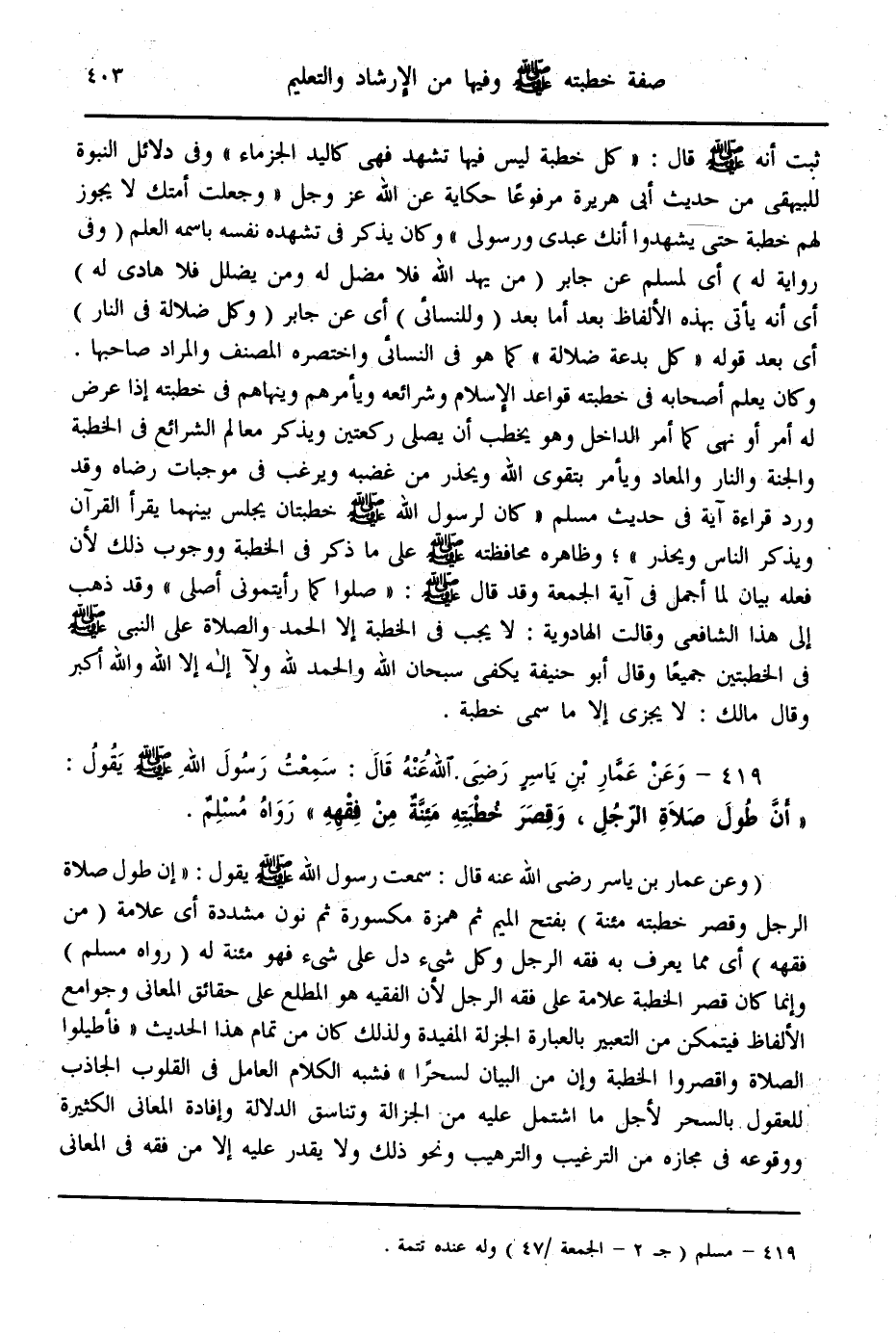 (419) - وَعَنْ عَمَّارِ بْنِ يَاسِرٍ - رَضِيَ اللَّهُ عَنْهُ - قَالَ: سَمِعْت رَسُولَ اللَّهِ - صَلَّى اللَّهُ عَلَيْهِ وَسَلَّمَ - يَقُولُ: «إنَّ طُولَ صَلَاةِ الرَّجُلِ، وَقِصَرَ خُطْبَتِهِ مَئِنَّةٌ مِنْ فِقْهِهِ» رَوَاهُ مُسْلِمٌ