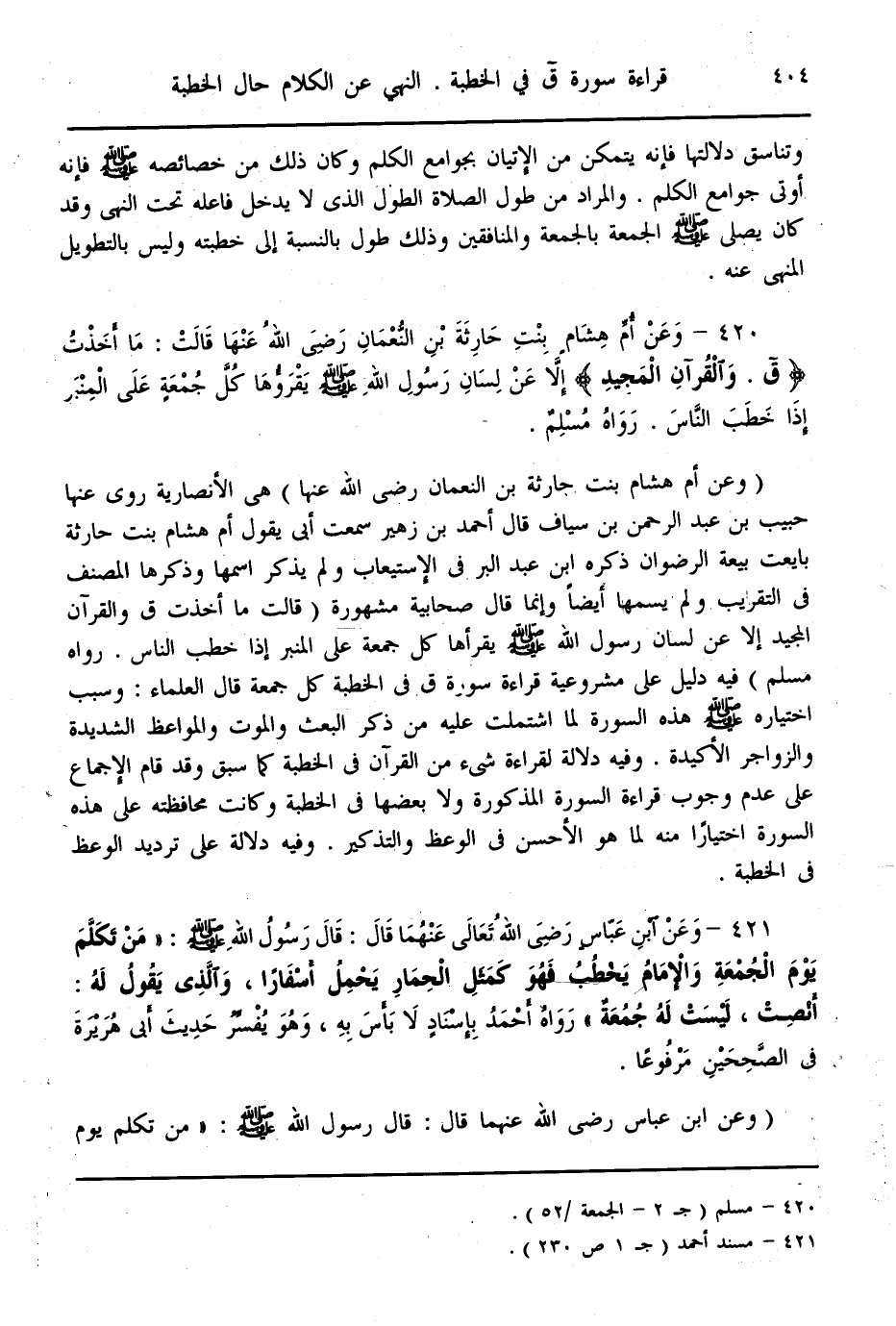 (420) - «وَعَنْ أُمِّ هِشَامِ بِنْتِ حَارِثَةَ بْنِ النُّعْمَانِ - رَضِيَ اللَّهُ عَنْهَا - قَالَتْ: مَا أَخَذْت {ق وَالْقُرْآنِ الْمَجِيدِ} [ق: 1] إلَّا عَنْ لِسَانِ رَسُولِ اللَّهِ - صَلَّى اللَّهُ عَلَيْهِ وَسَلَّمَ - يَقْرَؤُهَا كُلَّ جُمُعَةٍ عَلَى الْمِنْبَرِ إذَا خَطَبَ النَّاسَ» . رَوَاهُ مُسْلِمٌ.