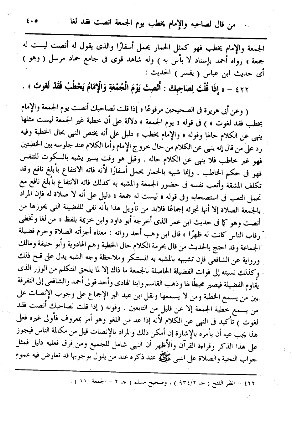 (422) - «إذَا قُلْتَ لِصَاحِبِك: أَنْصِتْ يَوْمَ الْجُمُعَةِ وَالْإِمَامُ يَخْطُبُ فَقَدْ لَغَوْتَ» .